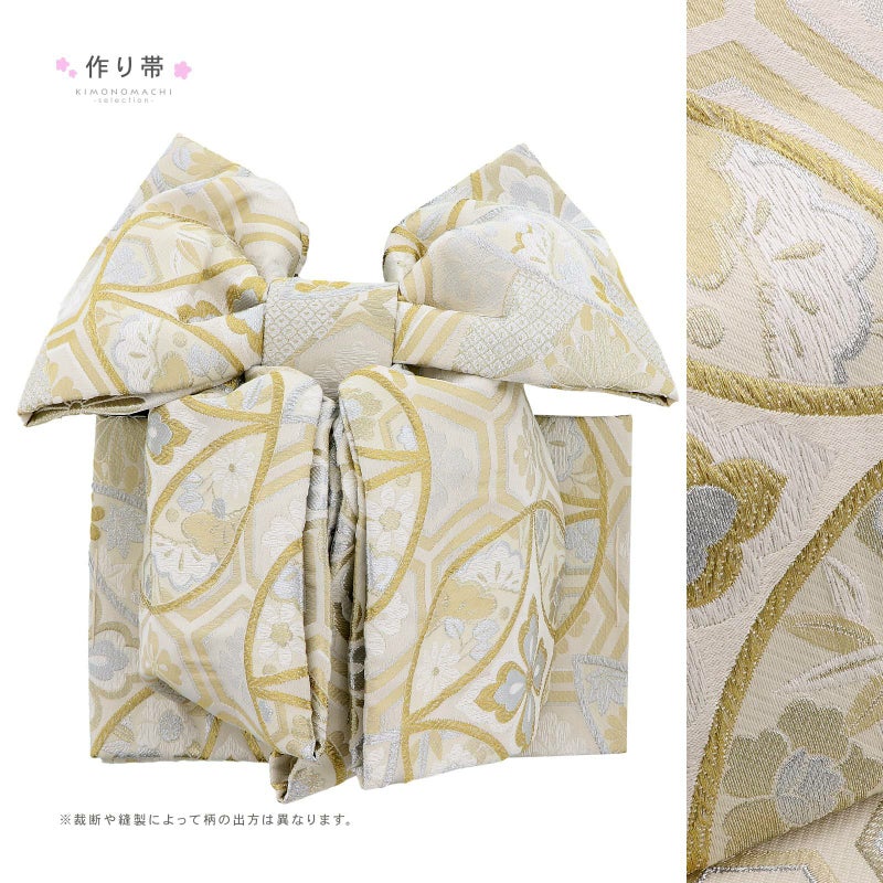 帯:ややグレイッシュなアイボリーの地に、浅い金色や白銀の亀甲文。その上に金銀で花菱の入った七宝紋が織り出されています。七宝の中に菊や松、桜などの花紋。