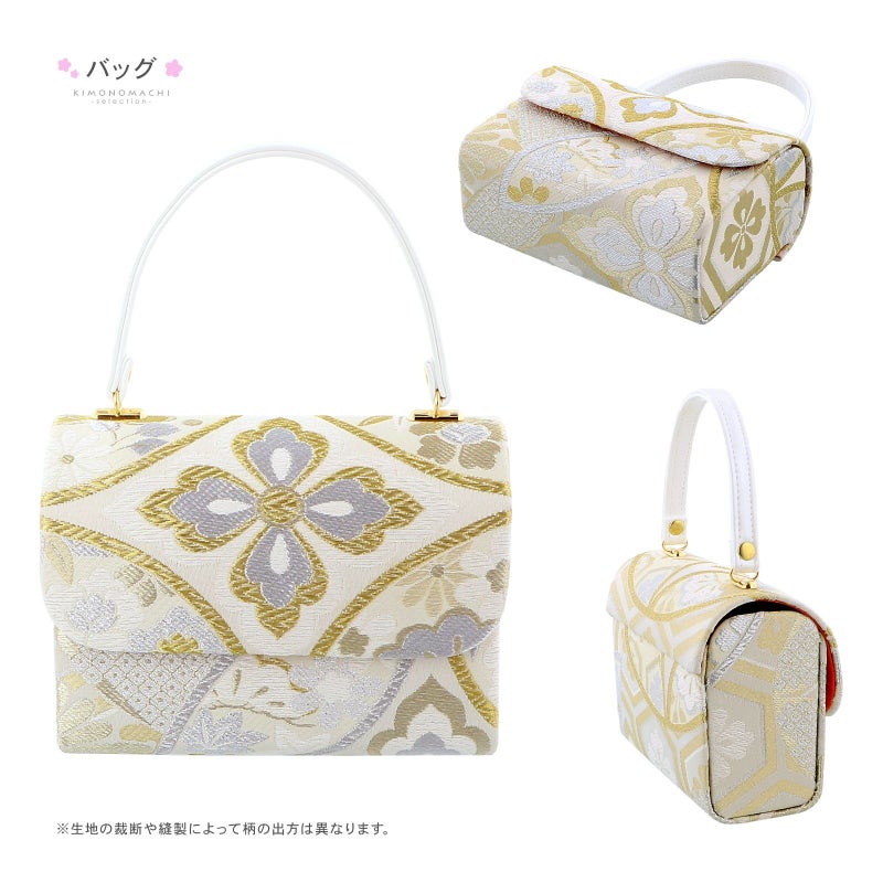 筥迫セット:バッグ、筥迫、草履の鼻緒は、グレイッシュなアイボリーの地に金や銀、白銀で表現された花紋の詰まった七宝紋。草履の台はオフホワイト。銀のビラカン。白の末広、白の房飾り。