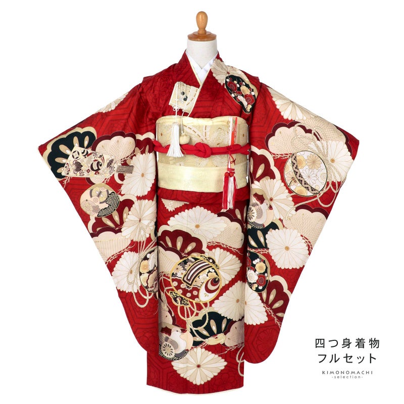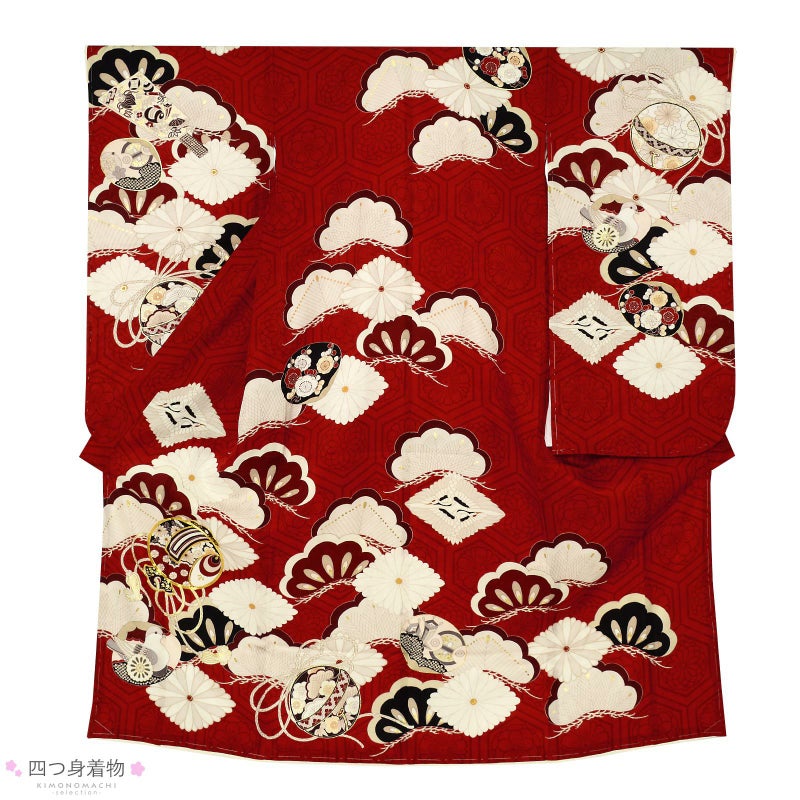 着物:地模様のある赤地に深い赤の花紋入り亀甲。生成り色、ベージュ、赤、深紅、臙脂に黒の配色で大きな松に菊菱、向かい鶴菱が表現されています。その上に小槌や鈴、羽子板、貝合わせなどの玩具文様。ポイントに金彩や金駒刺繍が施されています。アイボリーの重ね衿。薄ピンクの長襦袢。
