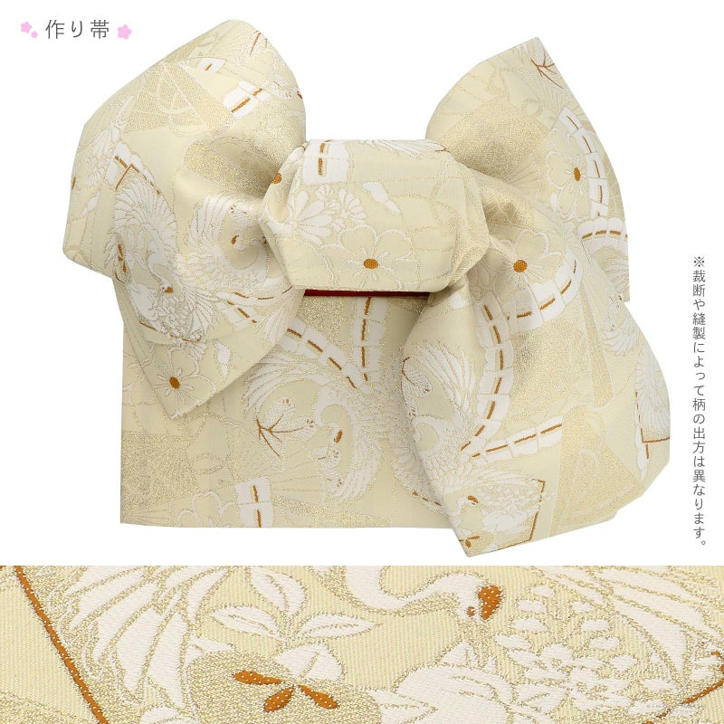 帯:アイボリーと白、ポイントに薄茶色、ゴールドで表現された花文様の檜扇に鶴の柄。