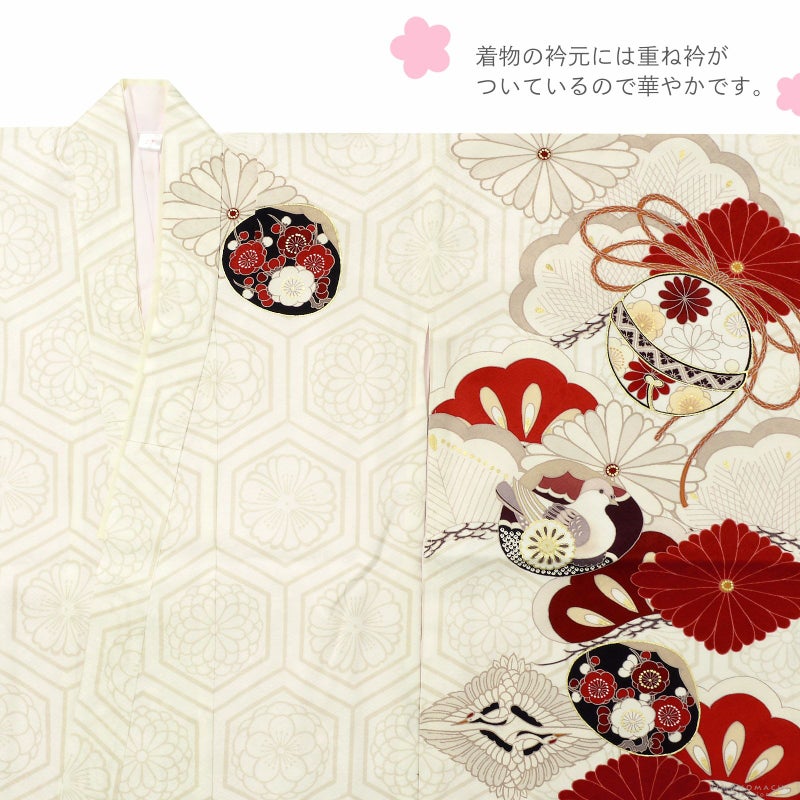 着物:地模様のある淡い象牙色の地にベージュの花紋入り亀甲。生成り色、グレージュ、朱、赤、臙脂に黒の配色で大きな松に菊菱、向かい鶴菱が表現されています。その上に小槌や鈴、羽子板、貝合わせなどの玩具文様。ポイントに金彩や金駒刺繍が施されています。アイボリーの重ね衿。薄ピンクの長襦袢。