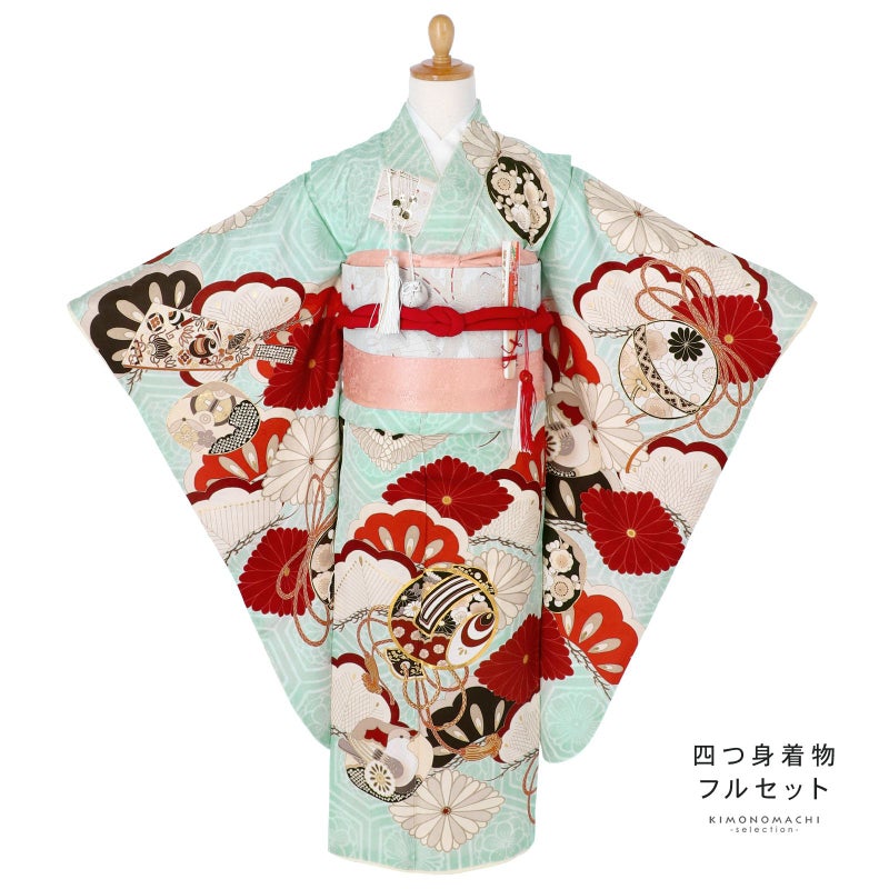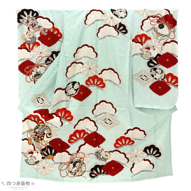 着物:地模様のある淡い水色の地に白の花紋入り亀甲。淡い生成り色、朱、赤、臙脂に黒の配色で大きな松に菊菱、向かい鶴菱が表現されています。その上に小槌や鈴、羽子板、貝合わせなどの玩具文様。ポイントに金彩や金駒刺繍が施されています。アイボリーの重ね衿。薄ピンクの長襦袢。