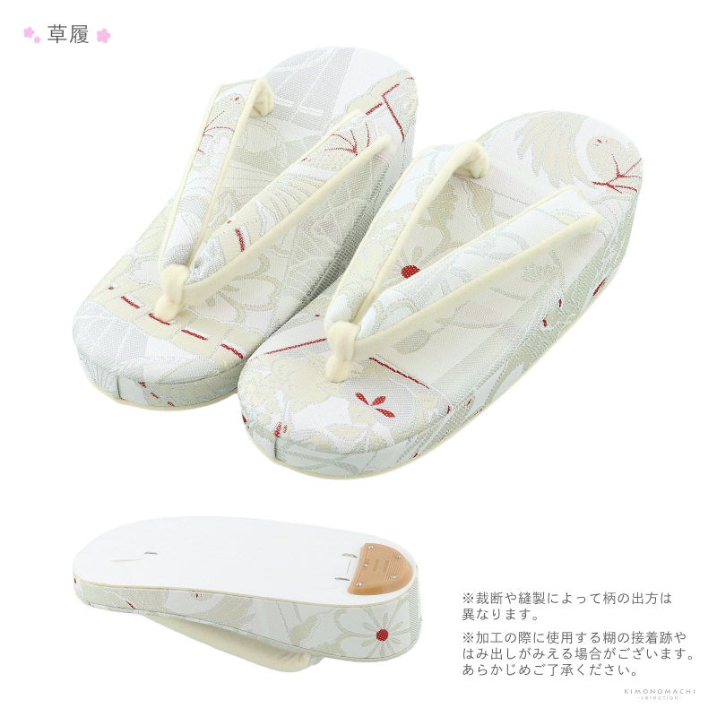 草履:台全長約21.5cm / 幅約7.7cm / 鼻緒幅約1.8cm / かかと高さ約4.8cm