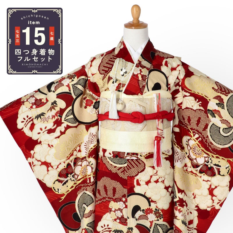 七歳の七五三(四つ身着物)の着付けに必要なものが揃ったフルセットです。お洒落で女の子らしい雰囲気。衿元も重ね衿がついているので華やかです。