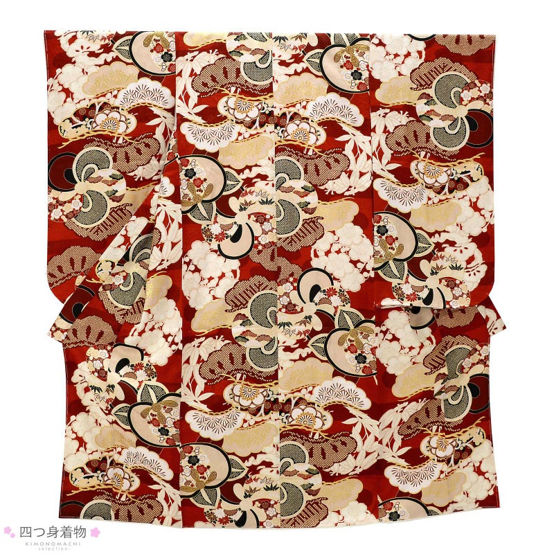 着物:地模様のある深い赤の地に赤の流水。淡い生成り色の松竹梅の花の丸に黒、臙脂、ベージュで大きなねじ花や橘が全体に表現されています。大きな花や橘の中に梅、菊などの花紋。ポイントに金彩。アイボリーの重ね衿。薄ピンクの長襦袢。
