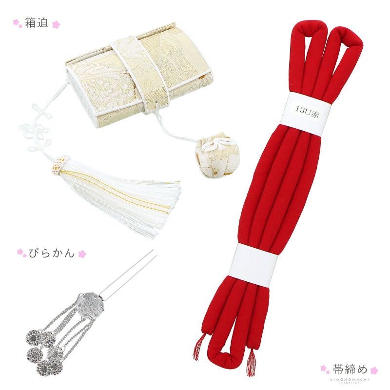しごき・帯揚げ・帯留め・丸ぐけ・半衿・箱迫・びらかん・扇子(末広):筥迫はアイボリーと白、ポイントに薄茶色、ゴールドで表現された花文様の檜扇に鶴の柄。銀のビラカン。赤の丸ぐけ帯締め。紗綾形に花の地模様のあるクリーム色の地に白い房のしごき。しごきと共布の帯揚げ。