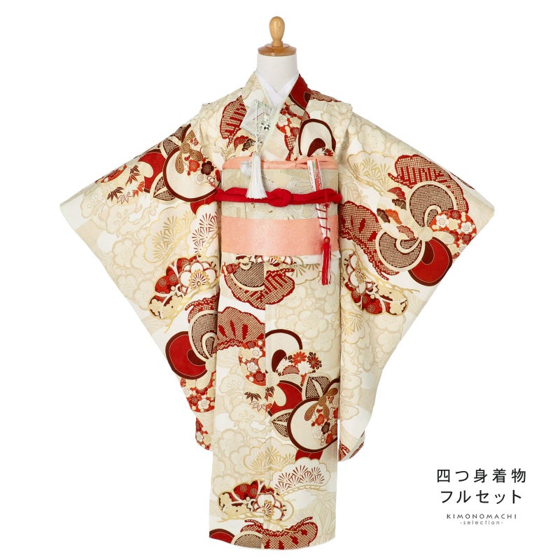 七歳の七五三(四つ身着物)の着付けに必要なものが揃ったフルセットです。お洒落で女の子らしい雰囲気。衿元も重ね衿がついているので華やかです。