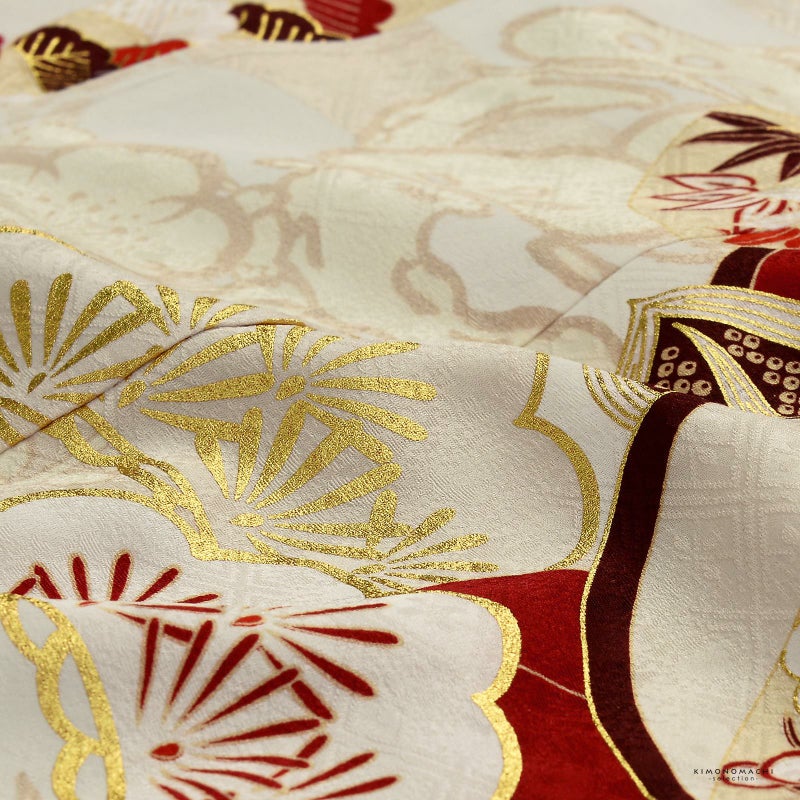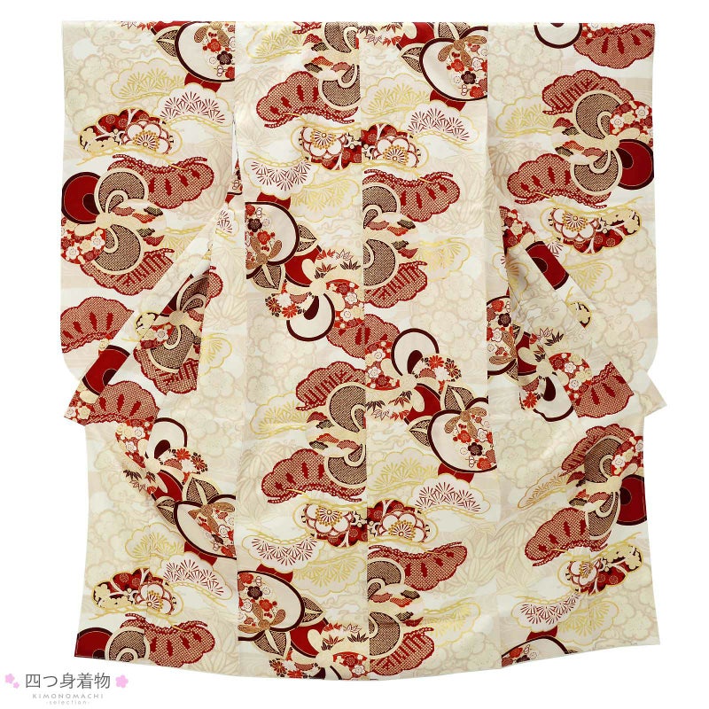 着物:地模様のある生成り色の地にベージュの流水。ベージュ色の松竹梅の花の丸に赤、臙脂、ベージュで大きなねじ花や橘が全体に表現されています。大きな花や橘の中に梅、菊などの花紋。ポイントに金彩。アイボリーの重ね衿。薄ピンクの長襦袢。