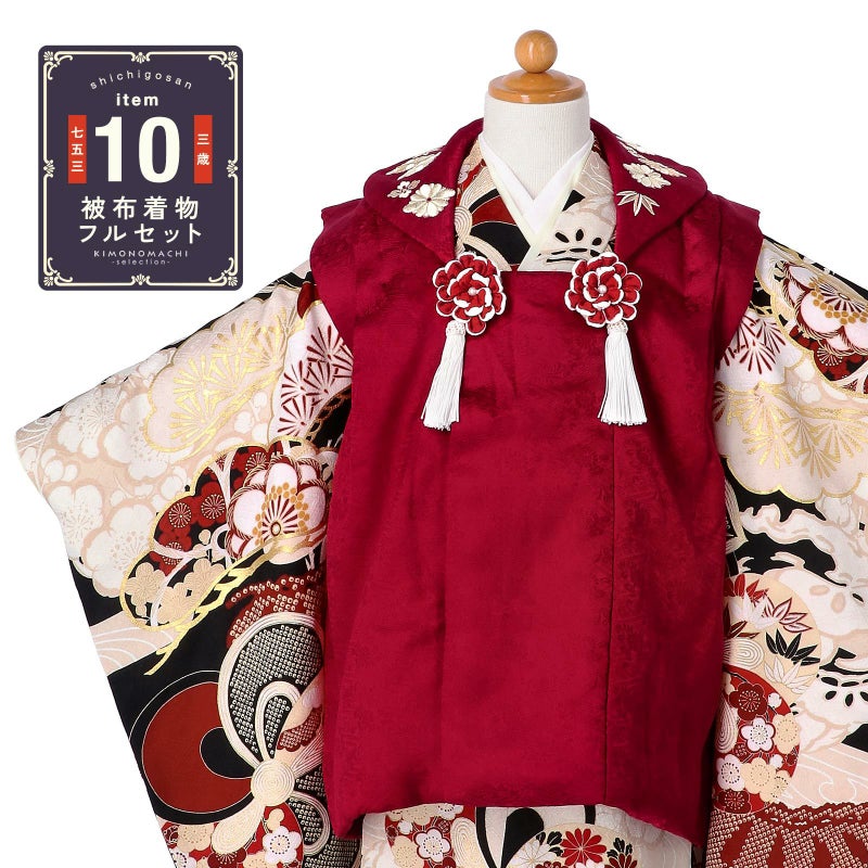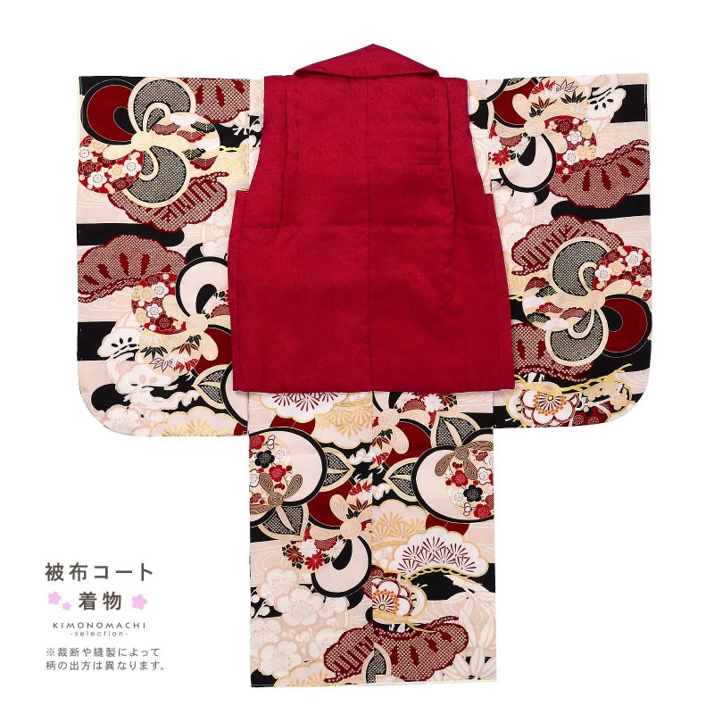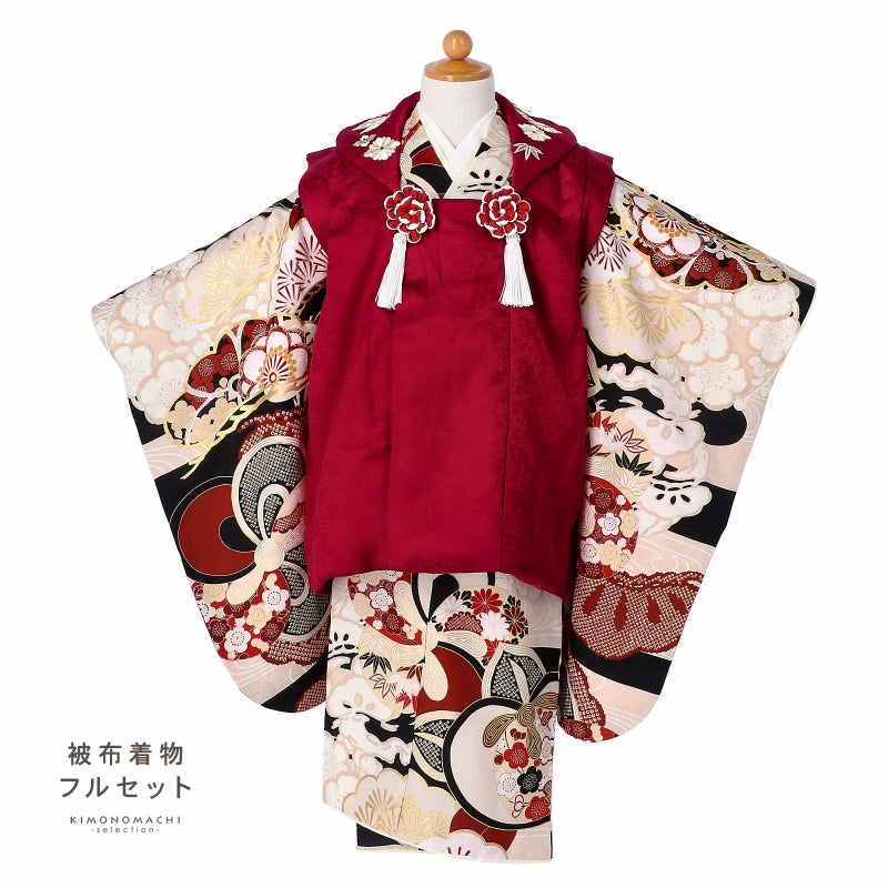 七五三 着物 3歳 女の子 ブランド被布セット 紅一点「ワインレッド、黒色 ねじ梅に橘と松竹梅」正絹 三歳女児被布セット 子供着物 フルセット 三才のお祝い着 3才向け【メール便不可】