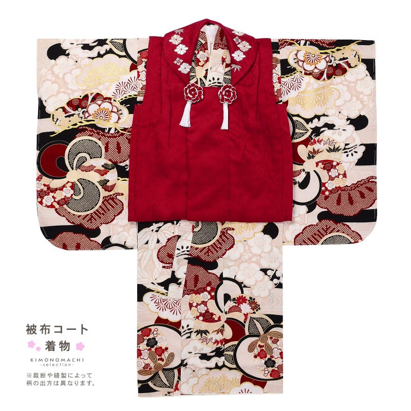 6. 七五三 着物 3歳 女の子 ブランド被布セット 紅一点「ワインレッド、黒色 ねじ梅に橘と松竹梅」正絹 三歳女児被布セット 子供着物 フルセット 三才のお祝い着 3才向け【メール便不可】