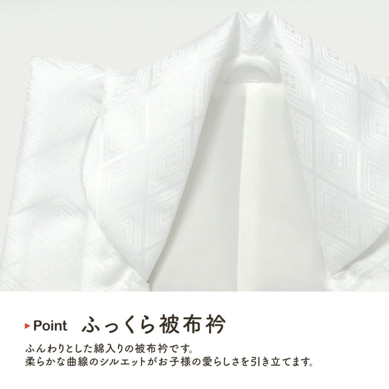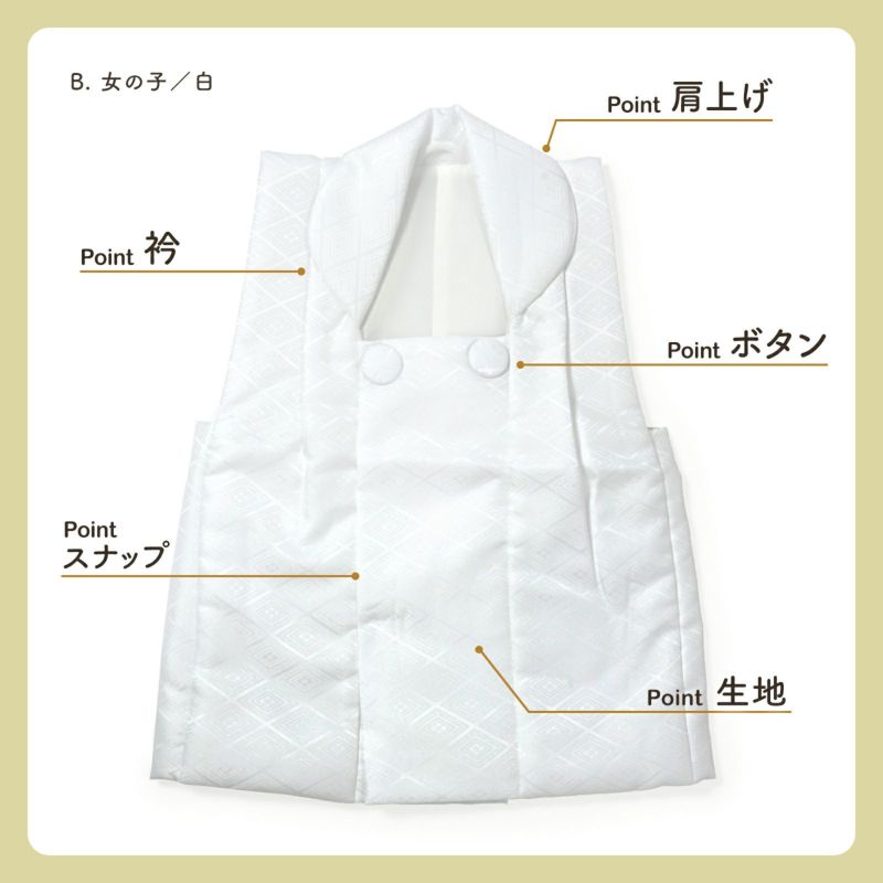 B.女の子 白:白。入れ子菱に花菱の地模様が織り出されています。ボタンは内側。