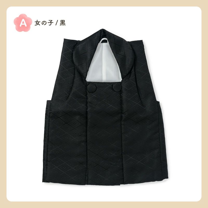 A.女の子 黒:黒。入れ子菱に花菱の地模様が織り出されています。ボタンは内側。