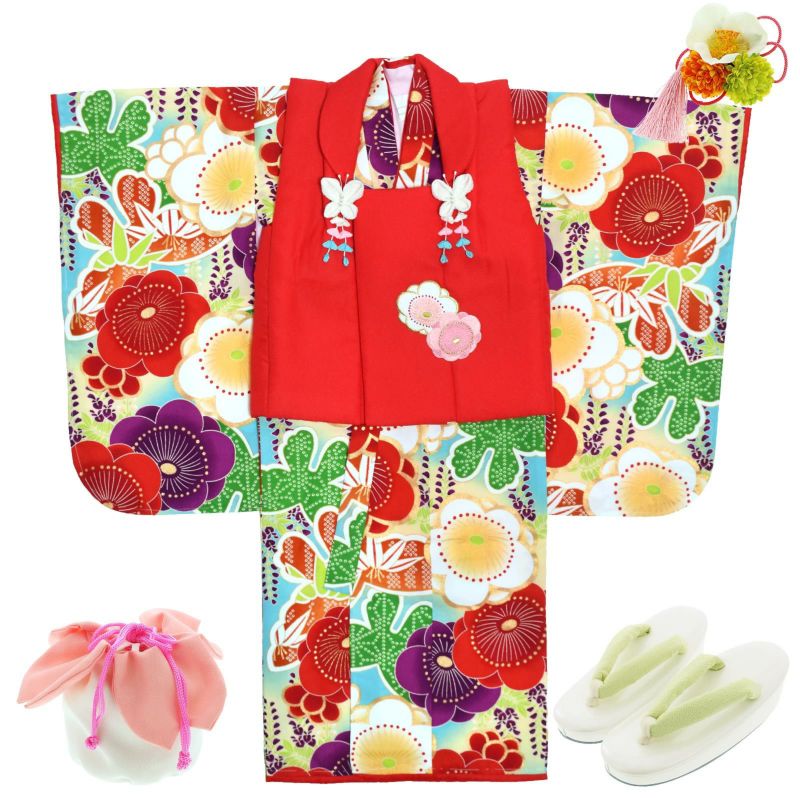【色柄】被布コートはくっきりとした赤。白とピンクの梅の花の刺繍。被布飾りは白い蝶にピンク、水色のつまみの飾りです。着物はクリーム色と水色のぼかしの地。赤、白、紫の大きな梅の花。明るい緑や橙色の蝶のシルエットの中に鹿の子や竹。合間に深紫の藤の花。重ね衿と袖口、裾のふきは赤。白い台に淡い緑の鼻緒の草履。白や緑、オレンジのお花の髪飾り、ピンクの巾着。