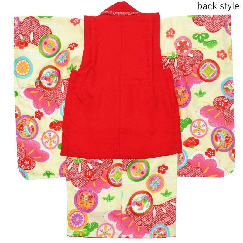【色柄】被布コートは紗綾形の地紋のある赤。白やピンク、水色の花の刺繍。被布飾りはピンクのつまみのお花。着物は紗綾形の地紋に淡いクリーム色の地。赤い鹿の子と明るいピンクの松の柄、宝尽くしの丸紋。明るい藤色やピンク、水色、緑などのにぎやかな色遣いです。重ね衿は赤と黄緑の二枚重ね。袖口、裾のふきは赤い鹿の子模様。草履は赤い台に赤い鹿の子模様とピンクの桜の鼻緒。巾着は赤の袋にピンク色地の桜の柄の返しがついています。ピンクや赤、紫色のつまみのお花の髪飾り。
