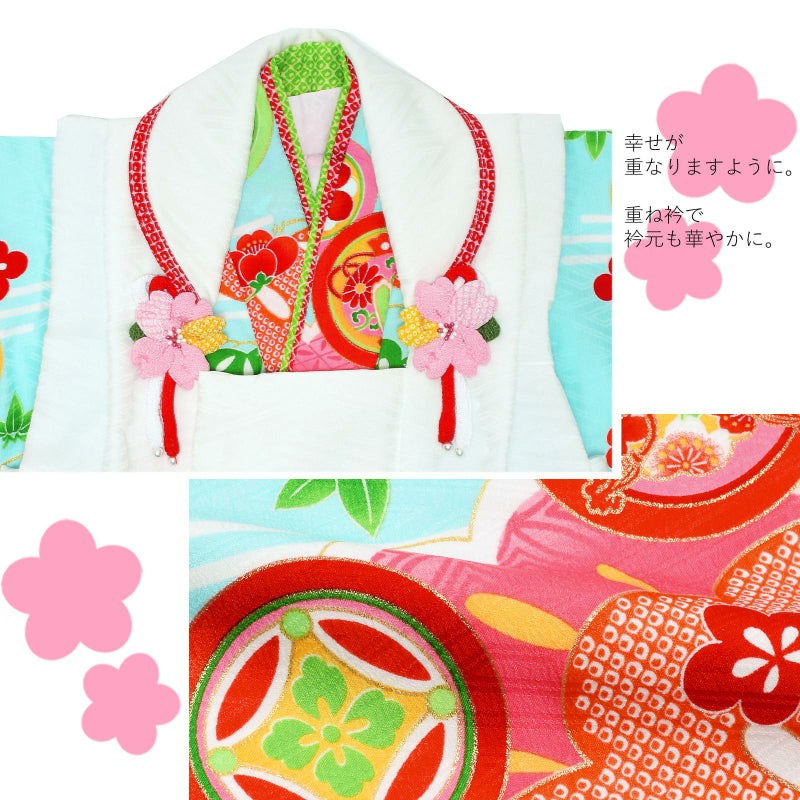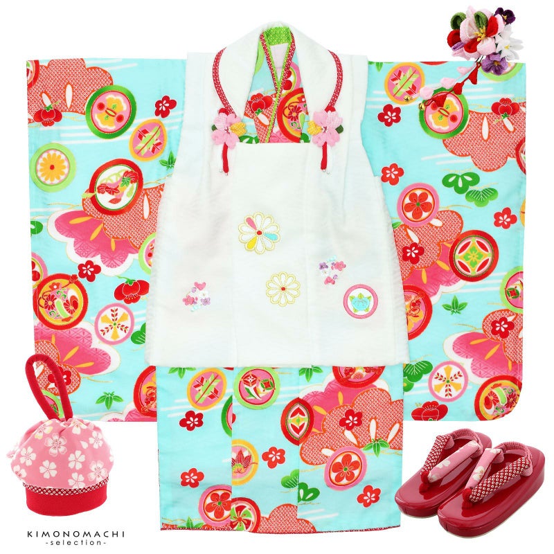 【色柄】被布コートは紗綾形の地紋のある白。白や薄黄色、水色の花の刺繍。被布飾りはピンクのつまみのお花。着物は紗綾形の地紋に淡い水色の地。オレンジ色の鹿の子と明るいピンクの松の柄、宝尽くしの丸紋。赤色やピンク、淡い橙色、緑などのにぎやかな色遣いです。重ね衿は黄緑と赤の二枚重ね。袖口、裾のふきは赤い鹿の子模様。草履は赤い台に赤い鹿の子模様とピンクの桜の鼻緒。巾着は赤の袋にピンク色地の桜の柄の返しがついています。ピンクや赤、紫色のつまみのお花の髪飾り。