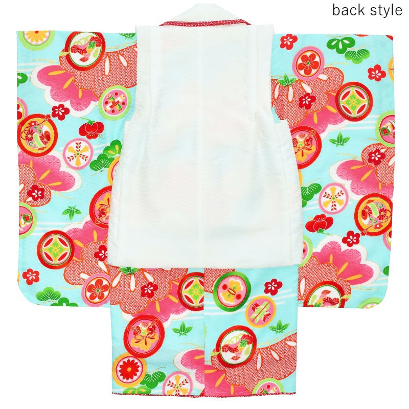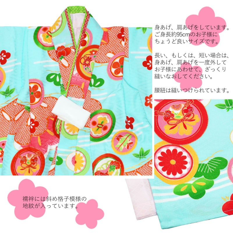 ※着物はすでに身上げ、肩上げが施されています。3歳のお祝いをするお子様の平均身長に合わせて、身長95cmぐらいのお子様がぴったりと着ていただけるサイズになっています。もしそれでは大きい、もしくは小さいようでしたら身上げ、肩上げを一度解いていただいて、お子様に合わせて、再度縫い上げてください。