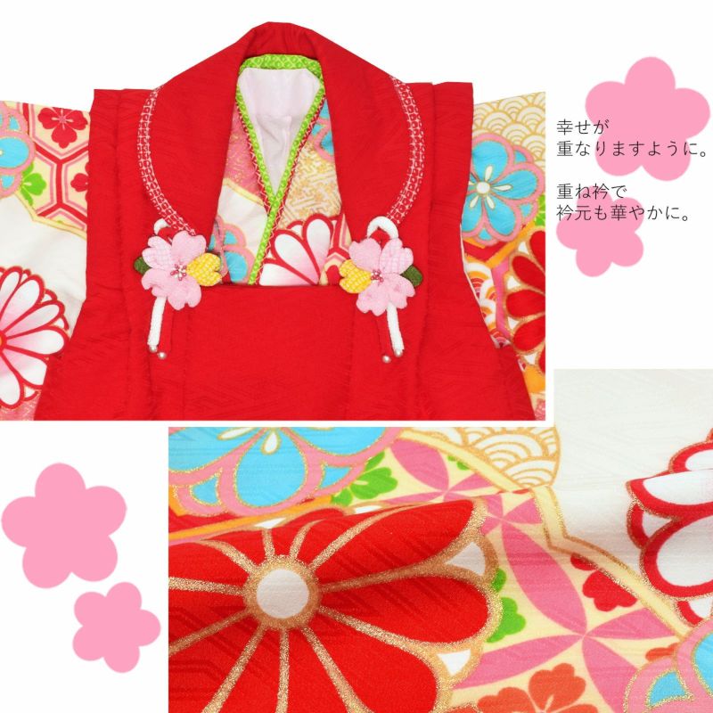 【色柄】被布コートは紗綾形の地紋のある赤。白やピンク、水色の花の刺繍。被布飾りはピンクのつまみのお花。着物は紗綾形の地紋に白の地。七宝や亀甲の模様に、大きな丸い菊の花。赤や明るい水色、ピンク、オレンジ、黄緑などのにぎやかな色遣いです。重ね衿は赤と黄緑の二枚重ね。袖口、裾のふきは赤い鹿の子模様。草履は赤い台に赤い鹿の子模様とピンクの桜の鼻緒。巾着は赤の袋にピンク色地の桜の柄の返しがついています。ピンクや赤、紫色のつまみのお花の髪飾り。