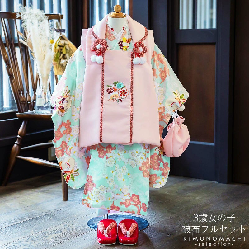 被布コートは淡いピンクの地に松や花々の刺繍。衿周りに赤の七宝模様のふち取り。つまみのお花とファーのポンポンの被布飾りがついています。着物は淡い浅葱色系の地に白や落ち着いたピンク色の梅の丸文様。桜の地模様のある生地です。白、紫、橙などに金彩の入った鶴の丸。白地に赤や水色のお花の刺繍半衿。薄ピンクの紗綾型の地模様の長襦袢。赤色系の草履。巾着は淡いピンクに返しの部分は赤地の七宝模様。