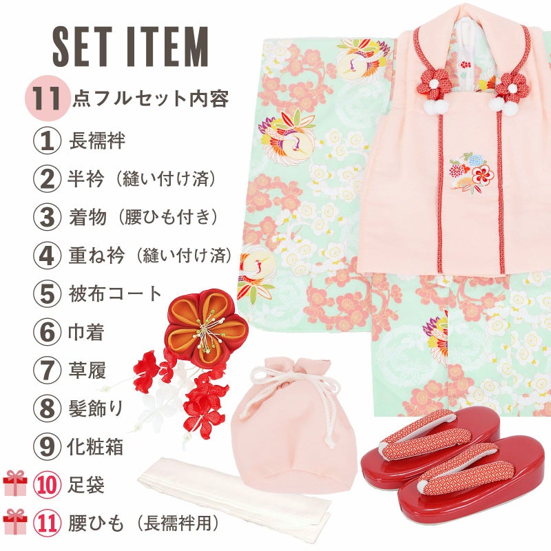 【商品内容】長襦袢・半衿(縫い付け済)・着物(腰ひも付き)・重ね衿(縫い付け済)・被布コート・巾着・草履・髪飾り・化粧箱・足袋(プレゼント)・腰ひも(長襦袢用/プレゼント)の11点セット
