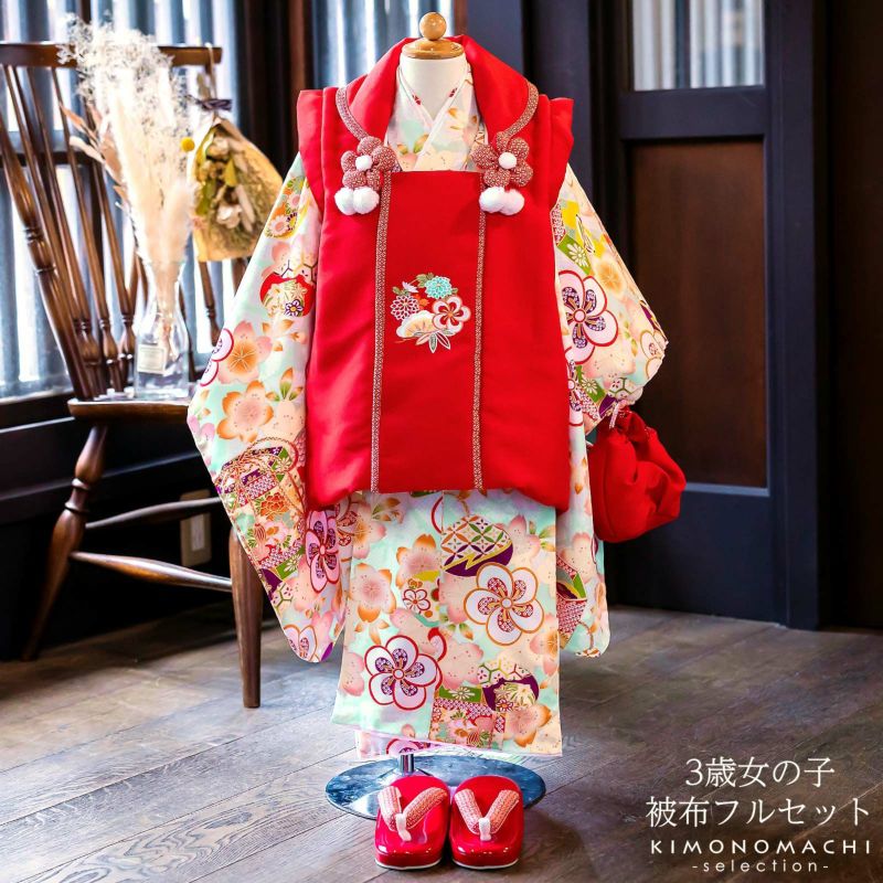 被布コートは赤地に松や花々の刺繍。衿周りに赤の七宝模様のふち取り。つまみのお花とファーのポンポンの被布飾りがついています。着物は淡い浅葱色系の地、淡いベージュにピンクや橙色のぼかしの入った桜模様。桜の地模様のある生地です。金彩の入った細やかな模様の貝桶。白に赤や紫のねじ梅。白地に赤や水色のお花の刺繍半衿。薄ピンクの紗綾型の地模様の長襦袢。赤色系の草履。巾着は赤に返しの部分は赤地の七宝模様。
