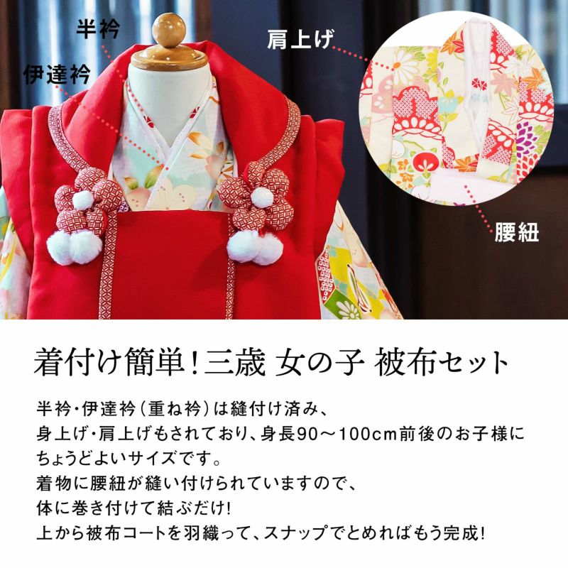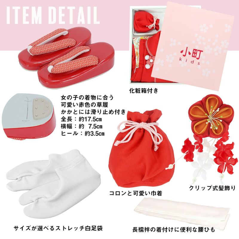 長襦袢・半衿(縫い付け済)・着物(腰ひも付き)・重ね衿(縫い付け済)・被布コート・巾着・草履・髪飾り・化粧箱のセットです。