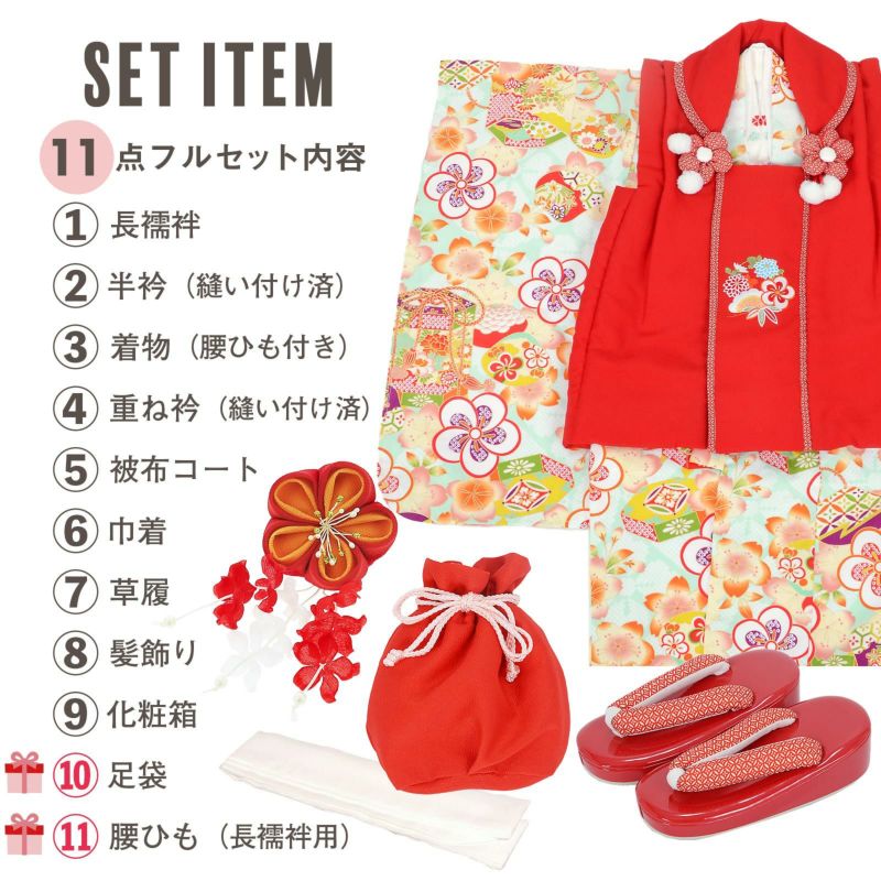 【商品内容】長襦袢・半衿(縫い付け済)・着物(腰ひも付き)・重ね衿(縫い付け済)・被布コート・巾着・草履・髪飾り・化粧箱・足袋(プレゼント)・腰ひも(長襦袢用/プレゼント)の11点セット