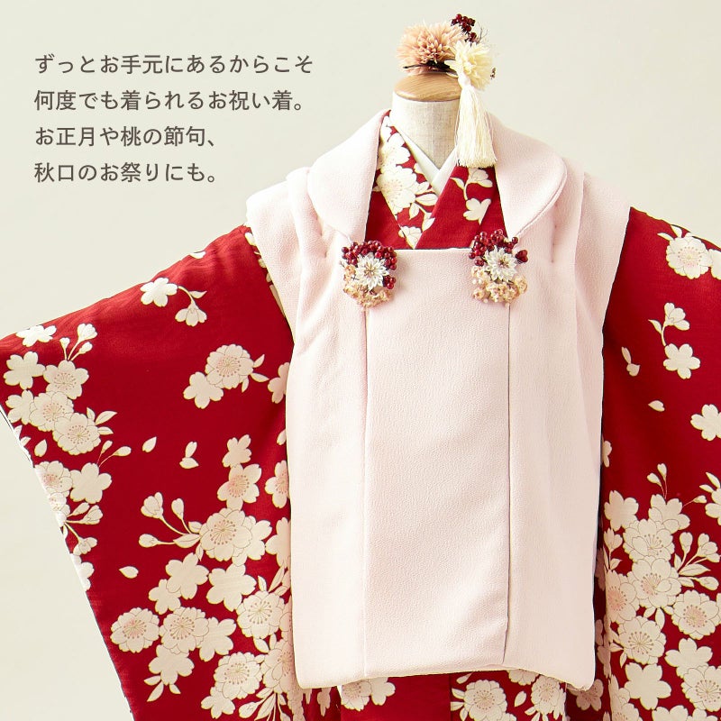 女の子の七五三に!3歳から着られる被布セットです。オシャレで女の子らしく華やかなデザイン。七五三だけでなく、お正月やひな祭りの節句にも。