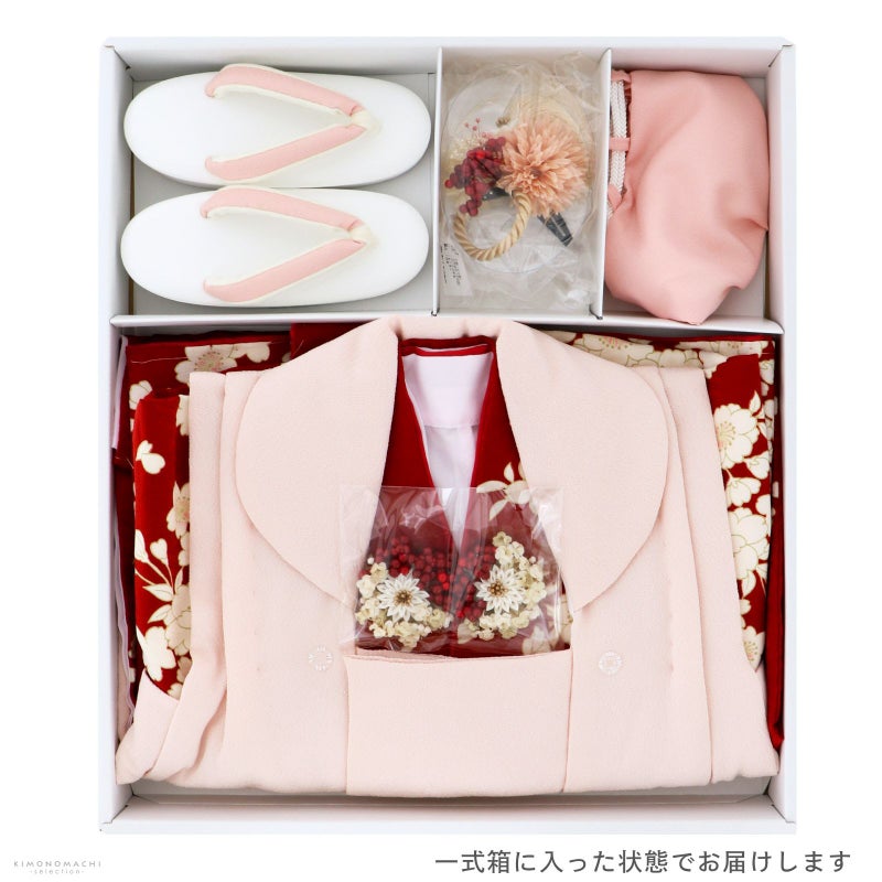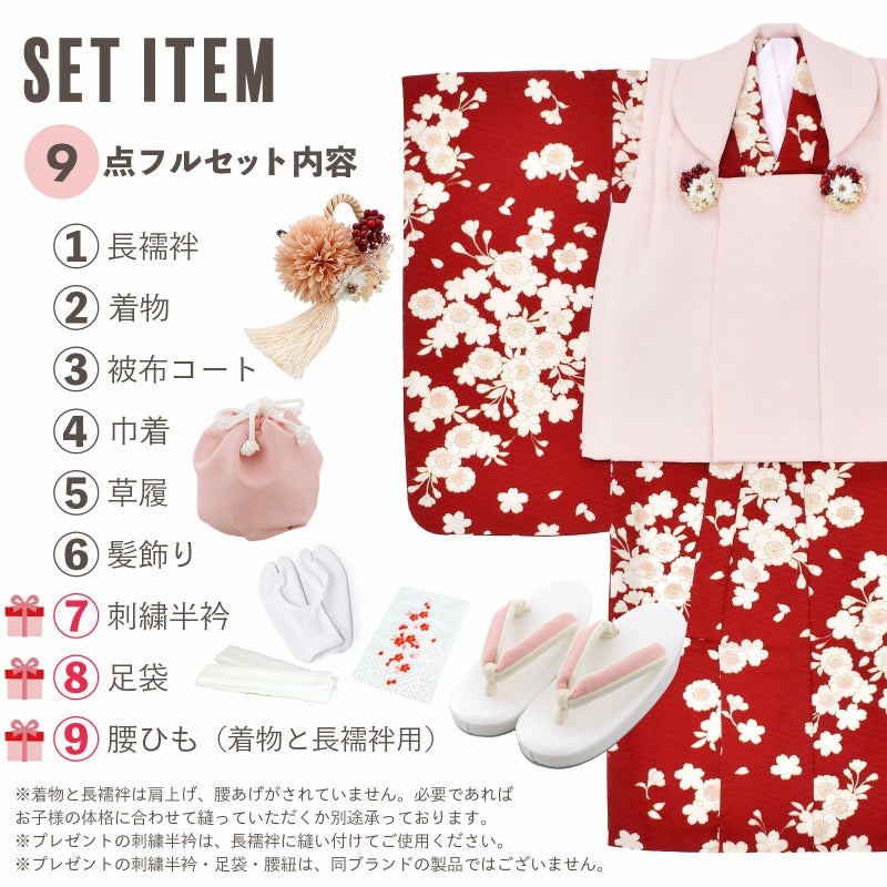 【商品内容】長襦袢・着物・被布コート・巾着・草履・髪飾り・刺繍半襟(プレゼント)・足袋(プレゼント)・腰ひも2本(プレゼント)の計9点