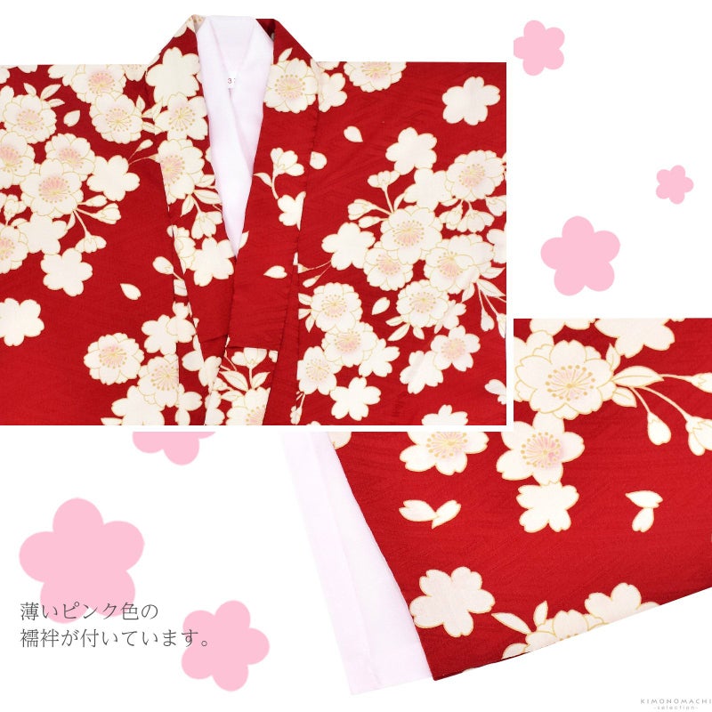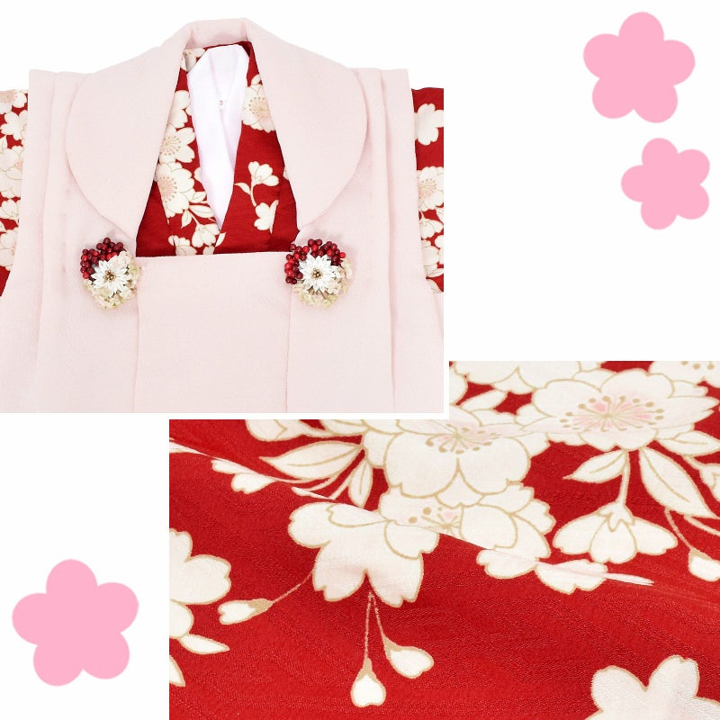 着物は紗綾形の地模様のある深い赤地、アイボリーに淡いピンクの桜の花模様。金茶色の輪郭線がアクセントになっています。長襦袢は薄ピンク。