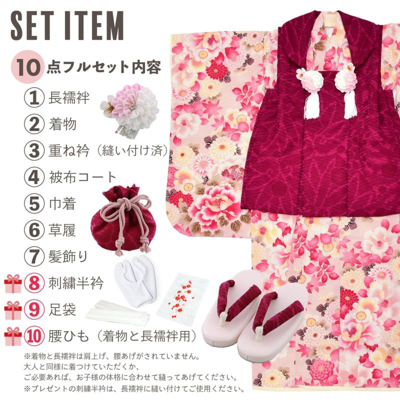 【商品内容】長襦袢・着物・重ね衿(縫い付け済)・被布コート・巾着・草履・髪飾り・刺繍半襟(プレゼント)・足袋(プレゼント)・腰ひも2本(プレゼント)の計10点