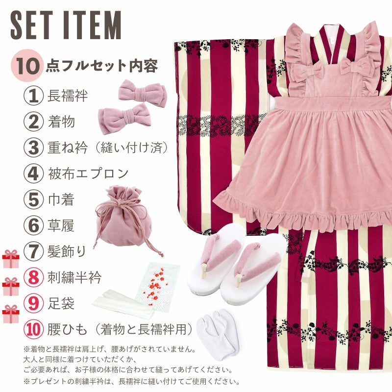 【商品内容】長襦袢・着物・重ね衿(縫い付け済)・被布エプロン・巾着・草履・髪飾り・刺繍半襟(プレゼント)・足袋(プレゼント)・腰ひも2本(プレゼント)の計10点