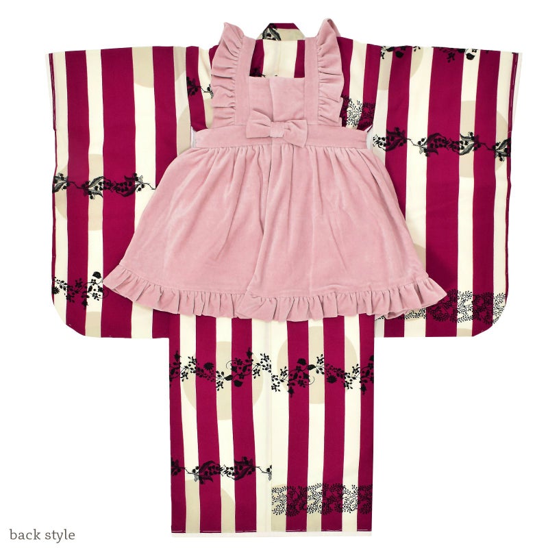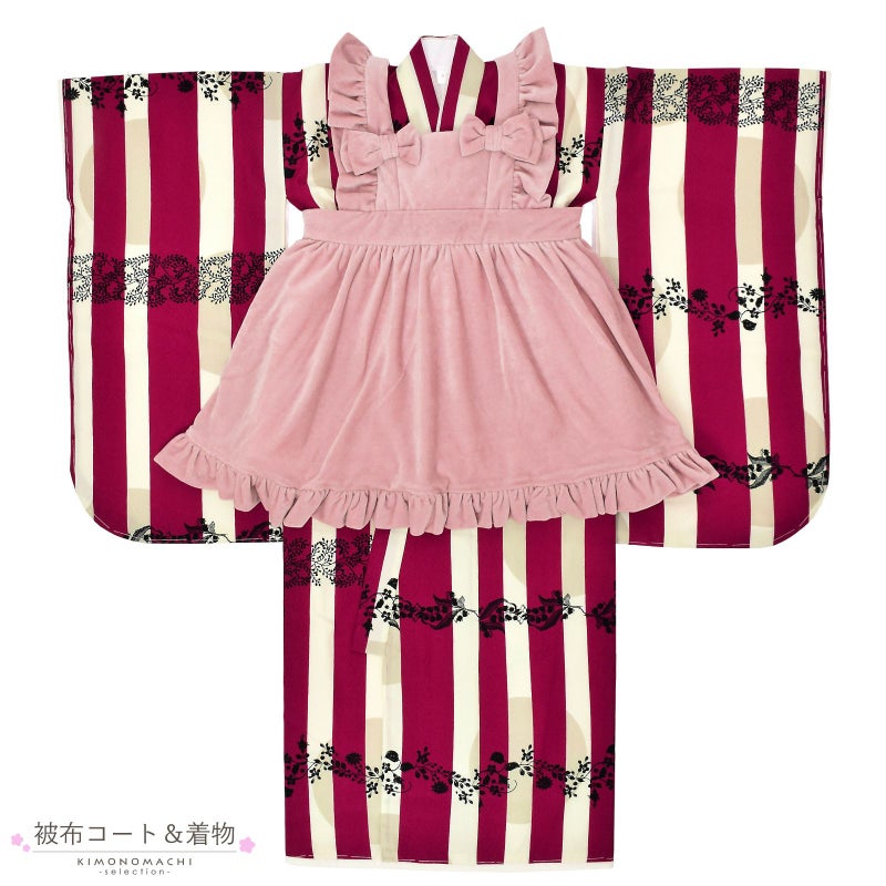 着物はアイボリーの地にベージュの大きなドット、その上に赤紫色のストライプ。黒のスズランなど草花のレース模様が横に描かれています。被布エプロンは、肩と裾にフリルのついたくすみピンクのコーデュロイ地のエプロンドレス。胸にリボン飾り。薄ピンクの長襦袢。エプロンと同系色の髪飾り、巾着、鼻緒。草履の台は白。