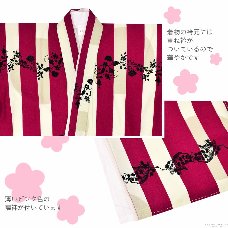 女の子の七五三に!3歳から着られる被布セットです。お着物には重ね衿が縫い付けられています。オシャレで女の子らしく華やかなデザイン。七五三だけでなく、お正月やひな祭りの節句にも。