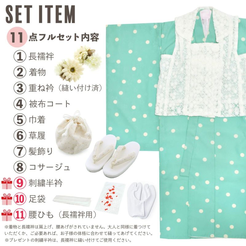 【商品内容】長襦袢・着物・重ね衿(縫い付け済)・被布コート・巾着・草履・髪飾り・コサージュ・刺繍半襟(プレゼント)・足袋(プレゼント)・腰ひも1本(プレゼント)の計11点