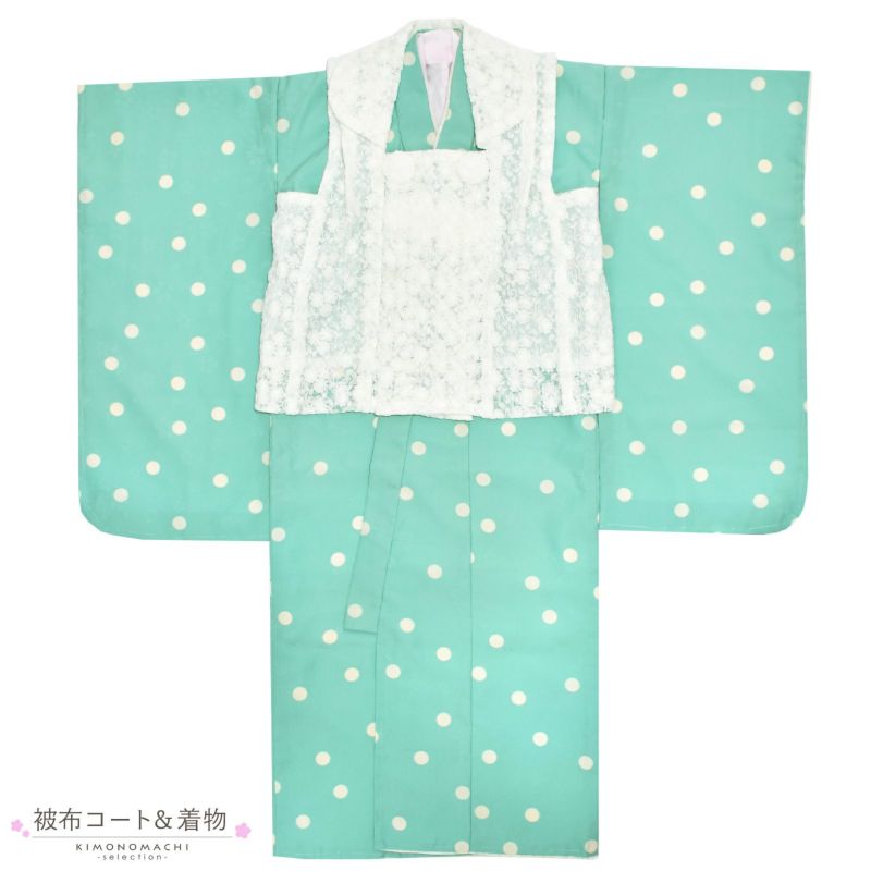 被布コートはオーガンジーの地に白のお花の刺繍レース。くるみボタンの被布飾り。着物は桜の地模様にややグレイッシュなウォーターグリーンの地に、白のランダムなポルカドット。重ね衿は淡いエクルベージュ。長襦袢は薄ピンク。巾着は白地にベージュのペイズリー柄の刺繍レース。草履は巾着と共生地の鼻緒に白の台。オフホワイト系のガーベラやパール、チュールのコサージュ2点。