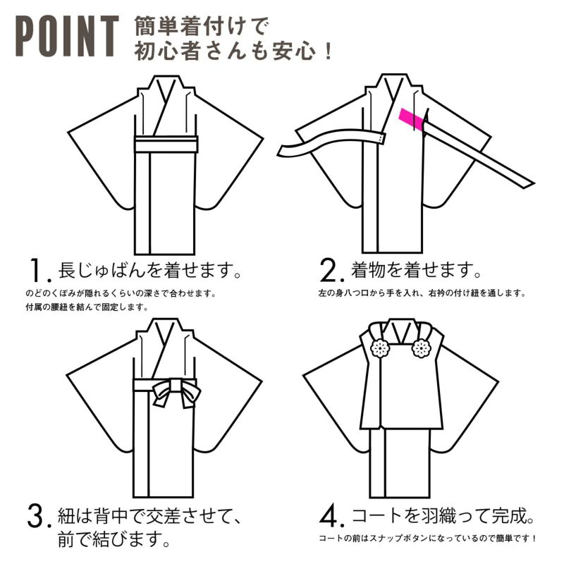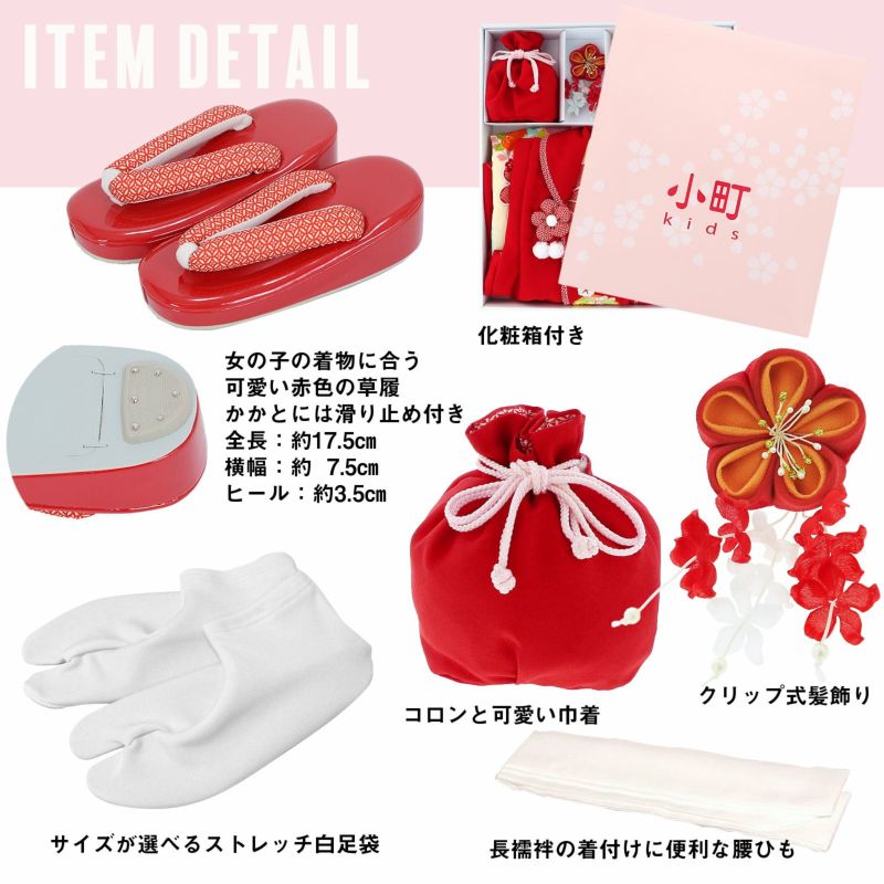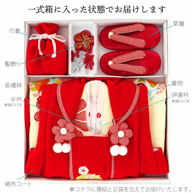 【商品内容】長襦袢・半衿(縫い付け済)・着物(腰ひも付き)・重ね衿(縫い付け済)・被布コート・巾着・草履・髪飾り・化粧箱・足袋(プレゼント)・腰ひも1本(プレゼント)の11点セット