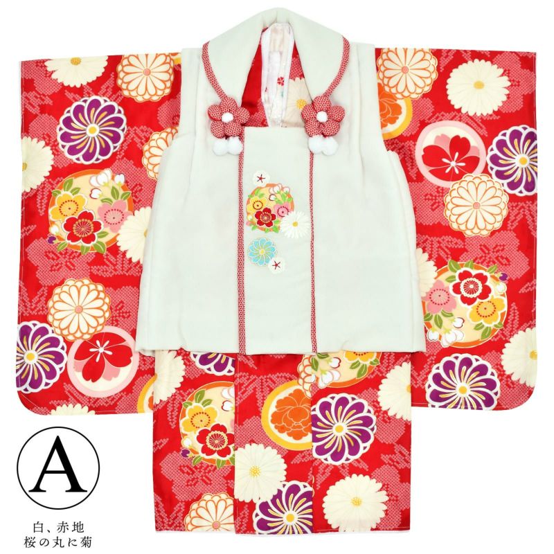 被布コートはオフホワイトの地に桜の丸や花々の刺繍。衿周りに赤の七宝模様のふち取り。つまみのお花とファーのポンポンの被布飾りがついています。着物は桜の地模様、赤地に疋田の竹や梅文様。橙やピンク、赤の桜の丸紋に、生成り色、紫などの菊の花。ポイントに金彩。重ね衿はごく淡いピンク。淡いエクルベージュ地に赤や水色のお花の刺繍半衿。薄ピンクの紗綾型の地模様の長襦袢。赤色系の草履。巾着は白地に赤の七宝模様の見返し。