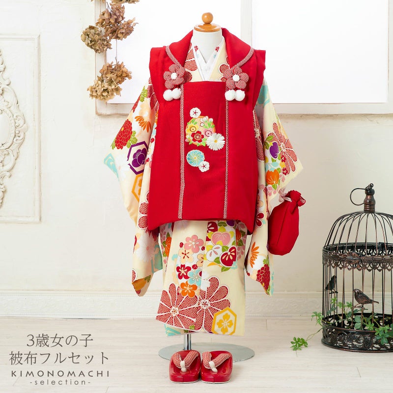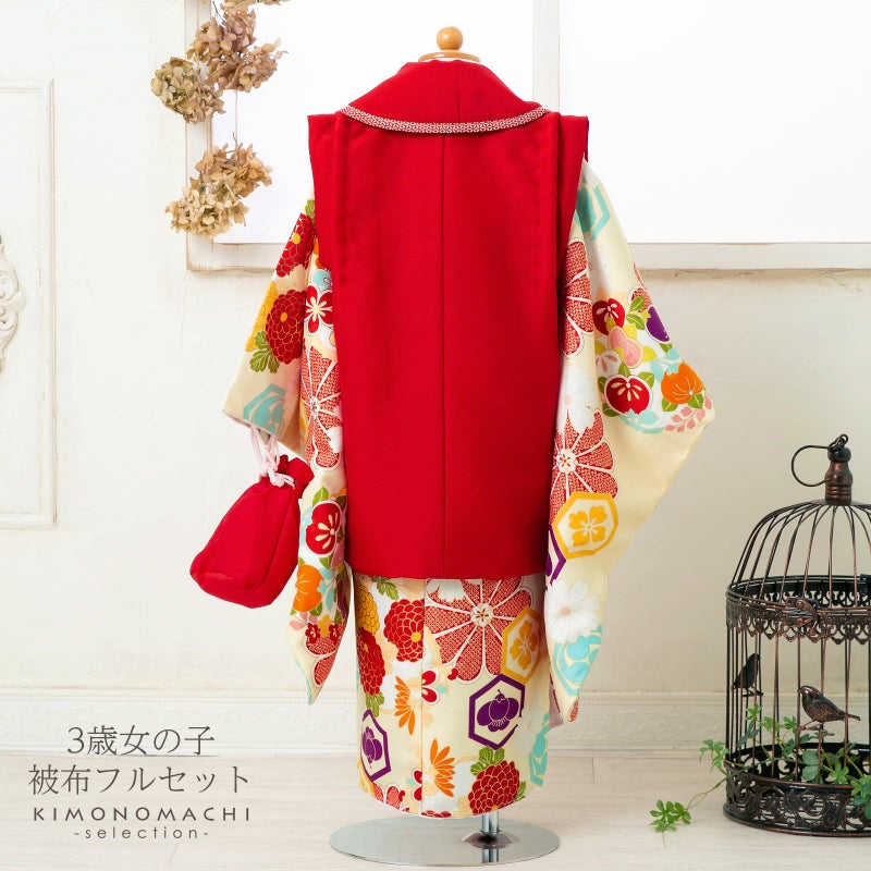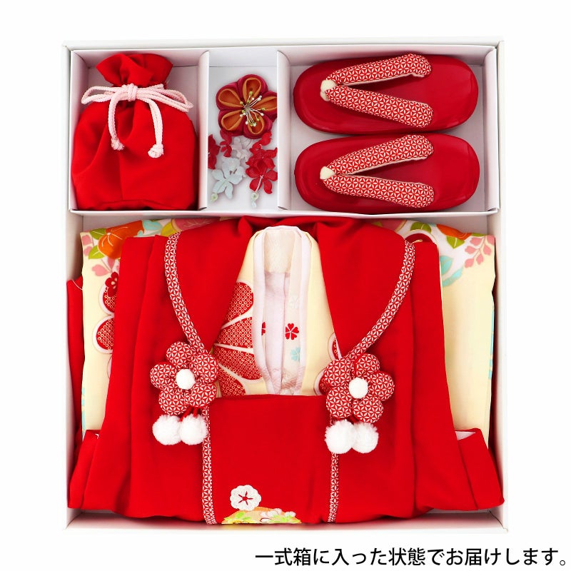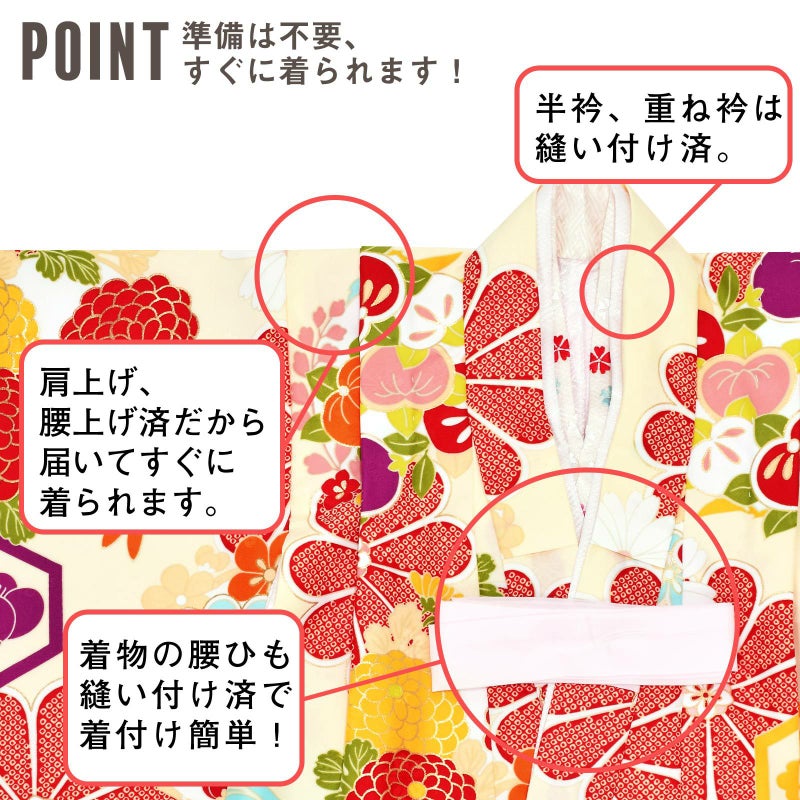 【商品内容】長襦袢・半衿(縫い付け済)・着物(腰ひも付き)・重ね衿(縫い付け済)・被布コート・巾着・草履・髪飾り・化粧箱・足袋(プレゼント)・腰ひも1本(プレゼント)の11点セット