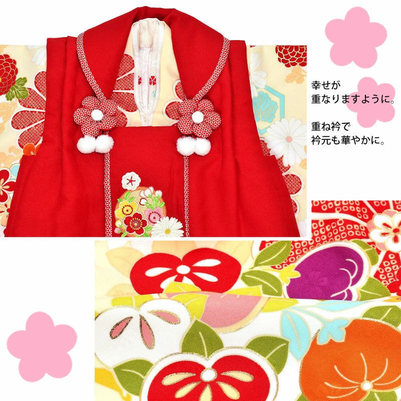 被布コートは赤地に桜の丸や花々の刺繍。衿周りに赤の七宝模様のふち取り。つまみのお花とファーのポンポンの被布飾りがついています。着物は桜の地模様、クリーム色地に赤の疋田の菊紋。赤、白、くすんだ桃色に水色、橙、紫の配色の橘の丸や八重菊、梅の花の丸。ポイントに金彩。重ね衿はごく淡いピンク。淡いエクルベージュ地に赤や水色のお花の刺繍半衿。薄ピンクの紗綾型の地模様の長襦袢。赤色系の草履。巾着は赤地に赤の七宝模様の見返し。