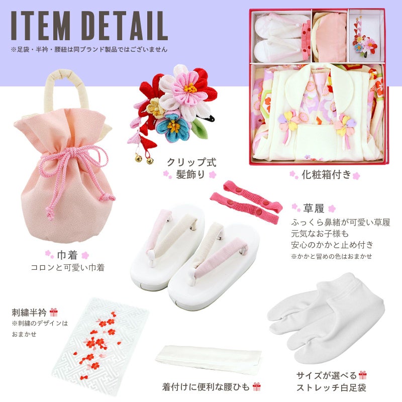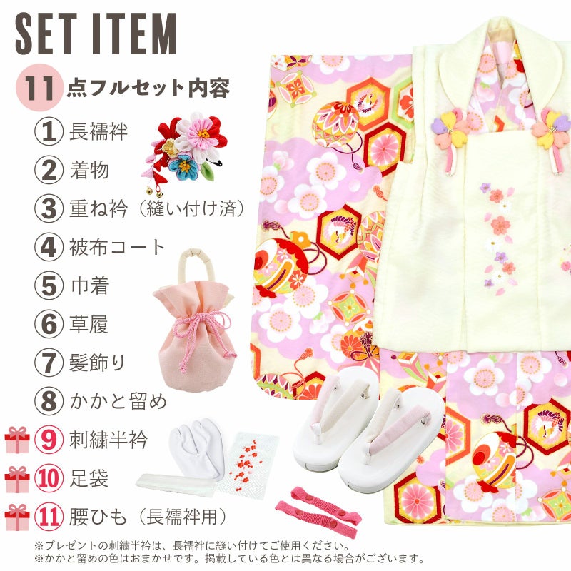 【商品内容】長襦袢・着物・重ね衿(縫い付け済)・被布コート・巾着・草履・髪飾り・かかと留め・刺繍半襟(プレゼント)・足袋(プレゼント)・腰ひも1本(プレゼント)の計11点