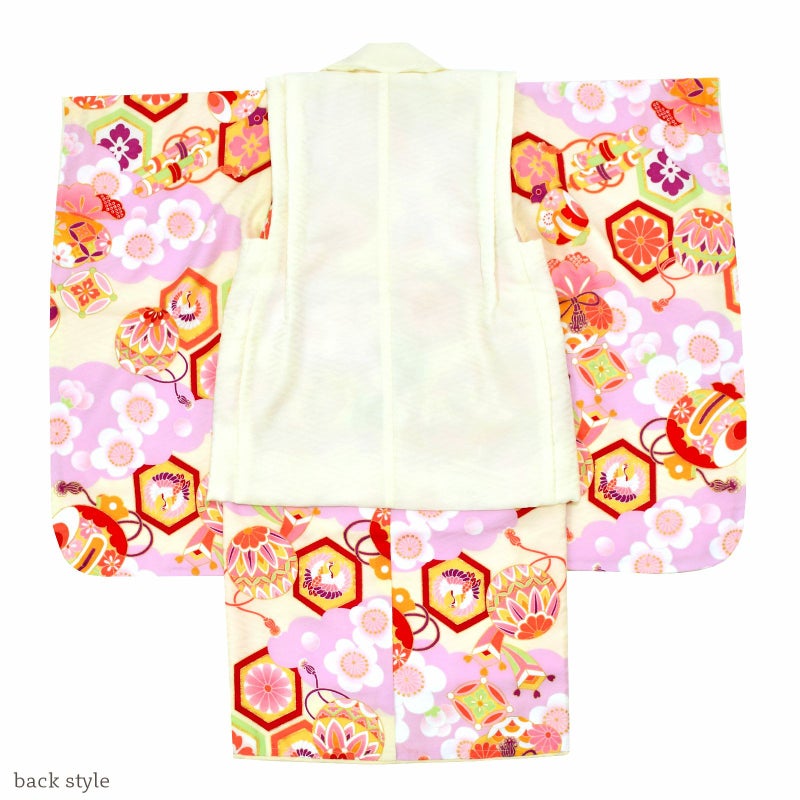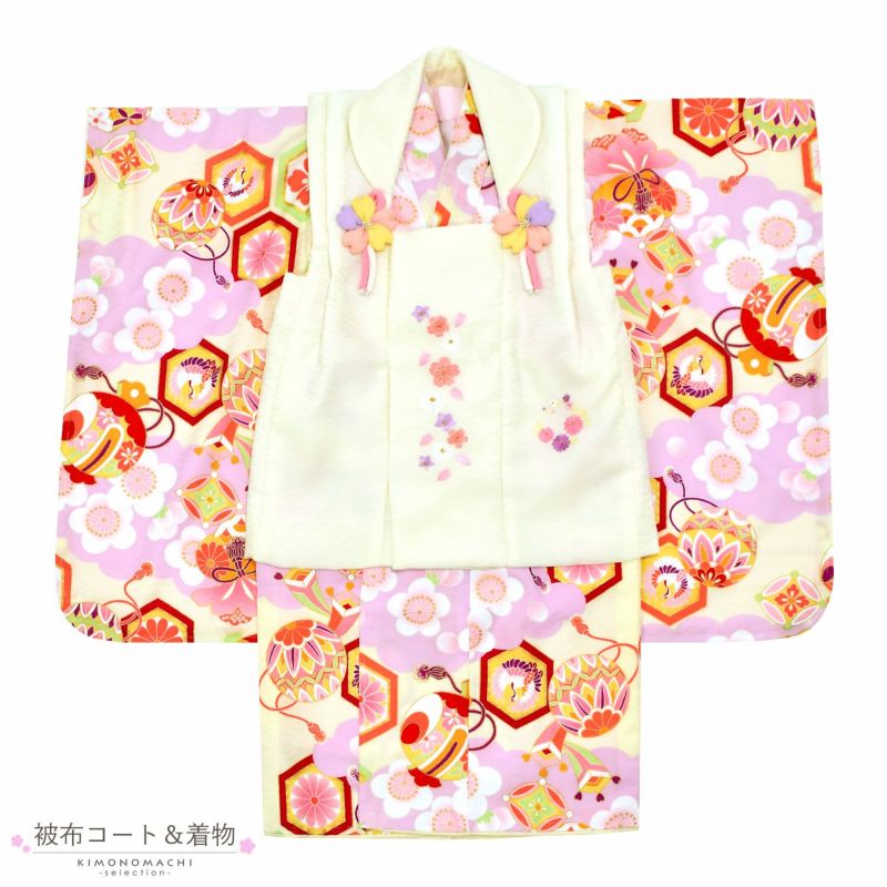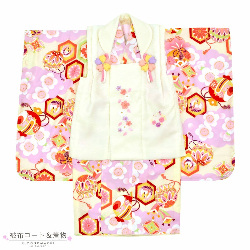 被布コートは淡いクリーム色の地にピンクや薄紫色の桜や花の丸の刺繍。薄ピンクや黄色のつまみの桜の被布飾り。着物は紗綾形の地模様のある淡いクリーム色の地に、藤色の雲に梅。赤、ピンク、薄緑や黄色の配色の亀甲や手毬、宝尽くし文様。ふきはオフホワイト。重ね衿は淡いクリーム色。薄ピンクの長襦袢。草履は白の台に淡いピンクの片ぼかしの鼻緒。ピンクのかかと止め。巾着は淡いネールピンク、持ち手は淡いクリーム色。紅白やピンク、水色、薄黄色などのつまみのお花の髪飾り。