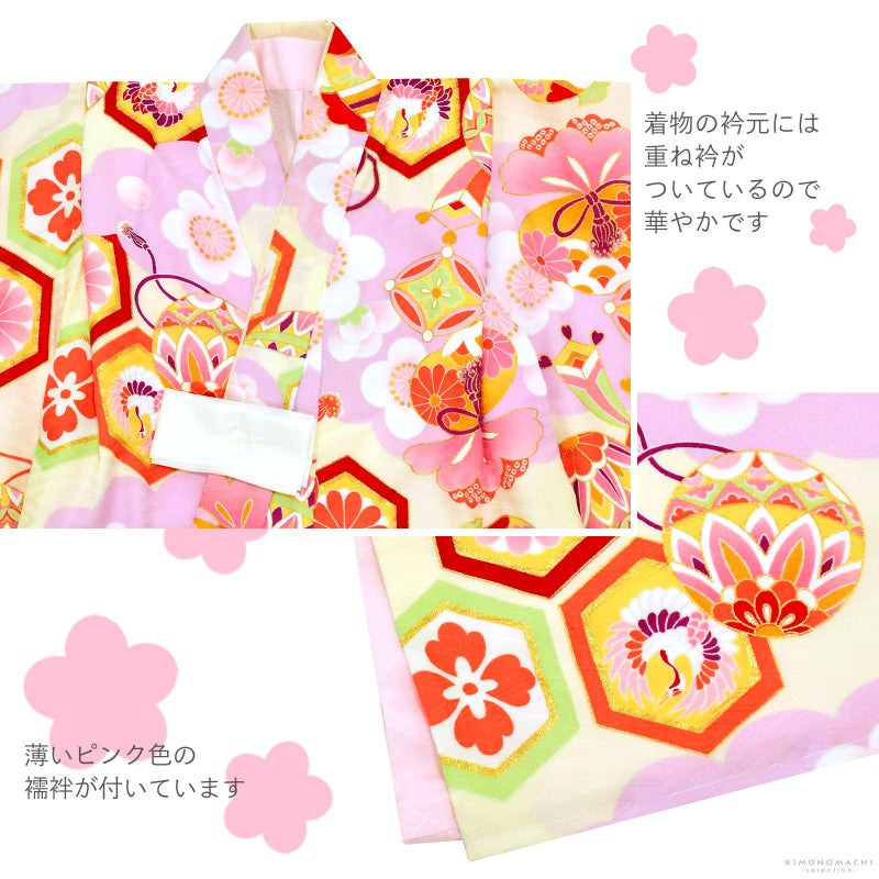 女の子の七五三に!3歳から着られる被布セットです。お着物には重ね衿が縫い付けられています。オシャレで女の子らしく華やかなデザイン。七五三だけでなく、お正月やひな祭りの節句にも。