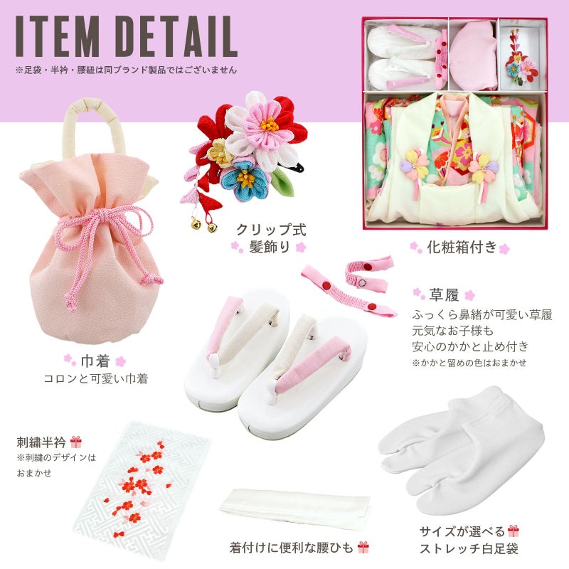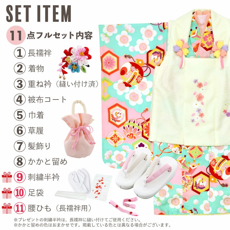 【商品内容】長襦袢・着物・重ね衿(縫い付け済)・被布コート・巾着・草履・髪飾り・かかと留め・刺繍半襟(プレゼント)・足袋(プレゼント)・腰ひも1本(プレゼント)の計11点