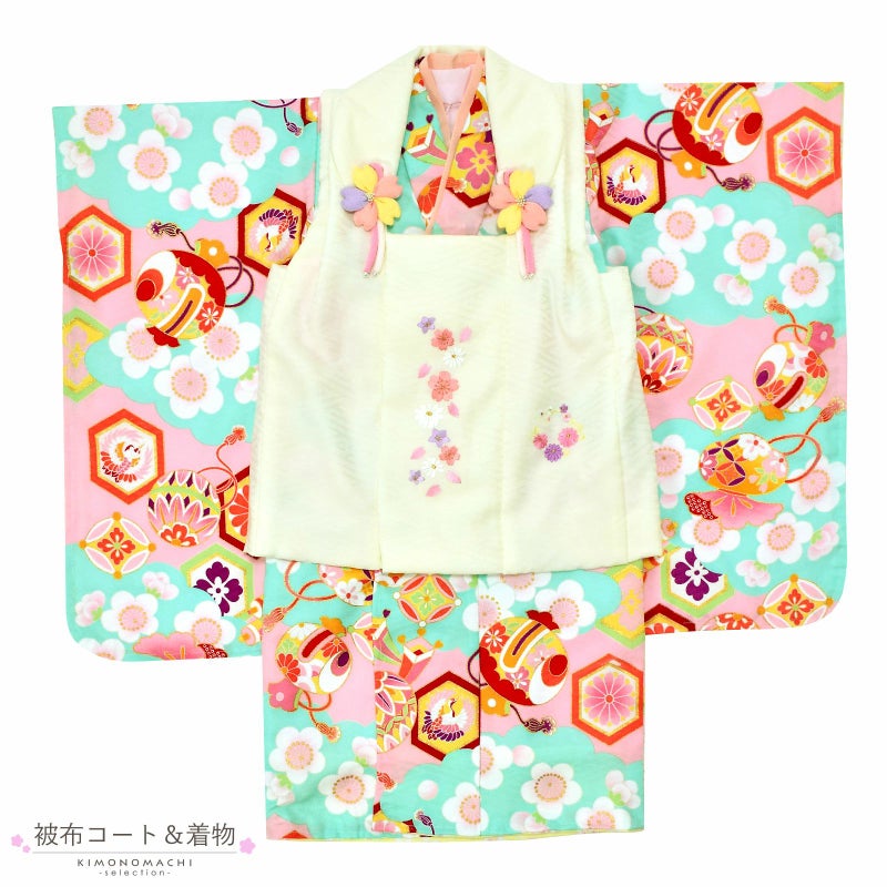 女の子の七五三に!3歳から着られる被布セットです。お着物には重ね衿が縫い付けられています。オシャレで女の子らしく華やかなデザイン。七五三だけでなく、お正月やひな祭りの節句にも。