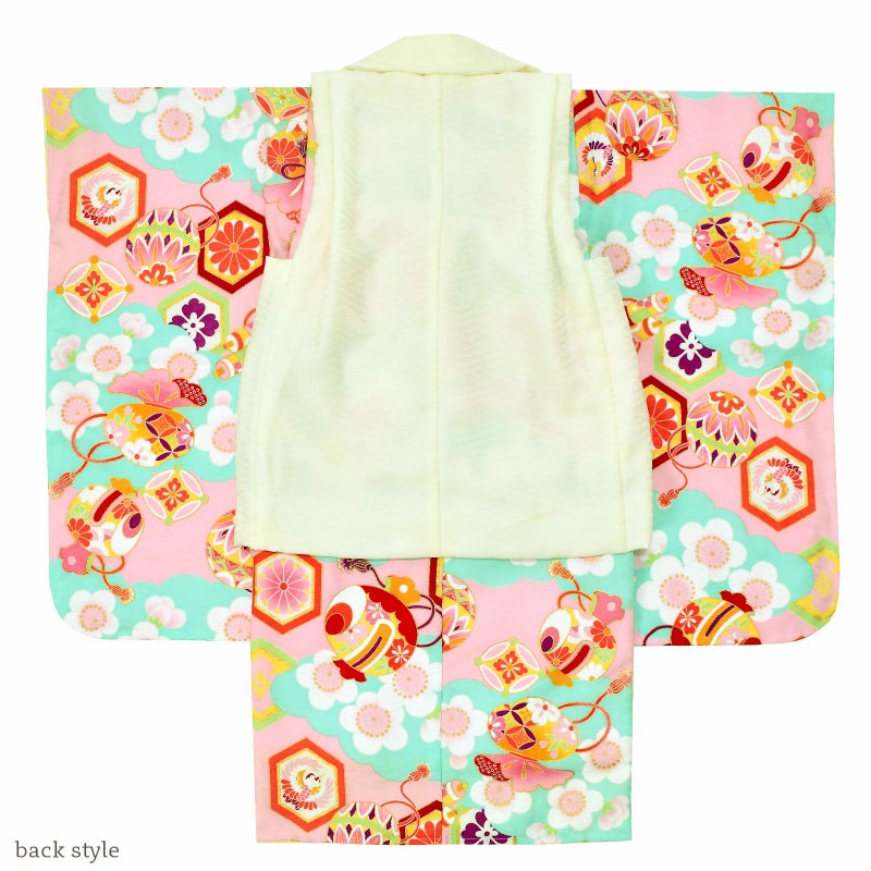 被布コートはアイボリーの地にピンクや薄紫色の桜や花の丸の刺繍。薄ピンクや黄色のつまみの桜の被布飾り。着物は紗綾形の地模様のあるピンク色に水色の雲取り。淡い黄色やピンク色を基調に赤や紫、橙色の宝尽くし文様や鶴入り亀甲など。重ね衿は淡いネールピンク。草履は白の台に薄ピンクと白の片ぼかしの鼻緒。ピンクのかかと止め。巾着は淡いピンクの袋にアイボリーの見返しと持ち手。赤やピンク、水色のつまみのお花の髪飾り。