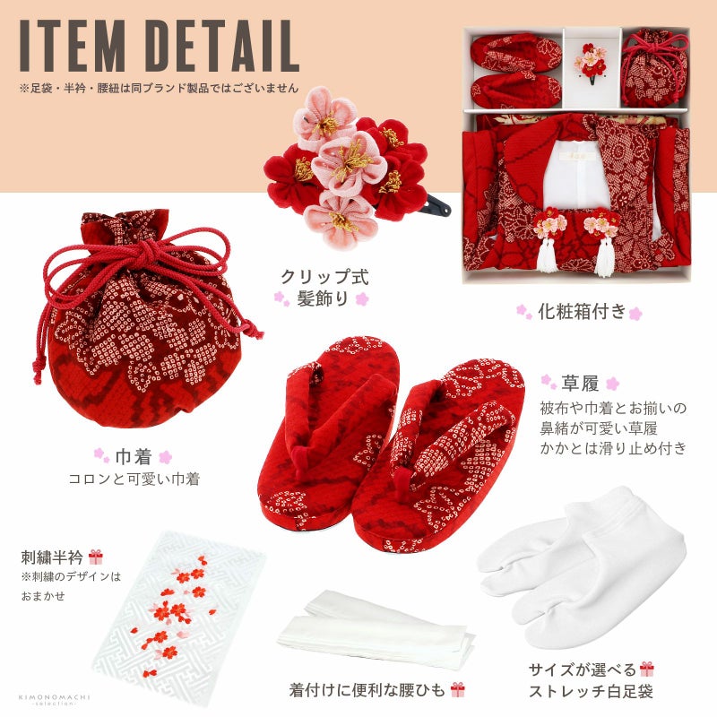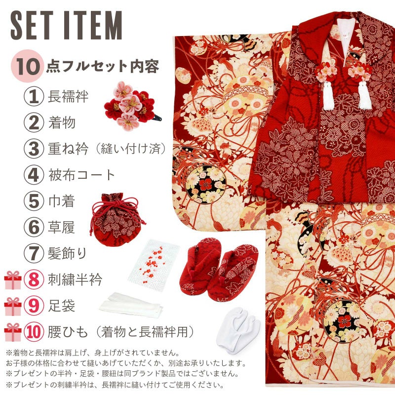 【商品内容】長襦袢・着物・重ね衿(縫い付け済)・被布コート・巾着・草履・髪飾り・刺繍半襟(プレゼント)・足袋(プレゼント)・腰ひも2本(プレゼント)の計10点