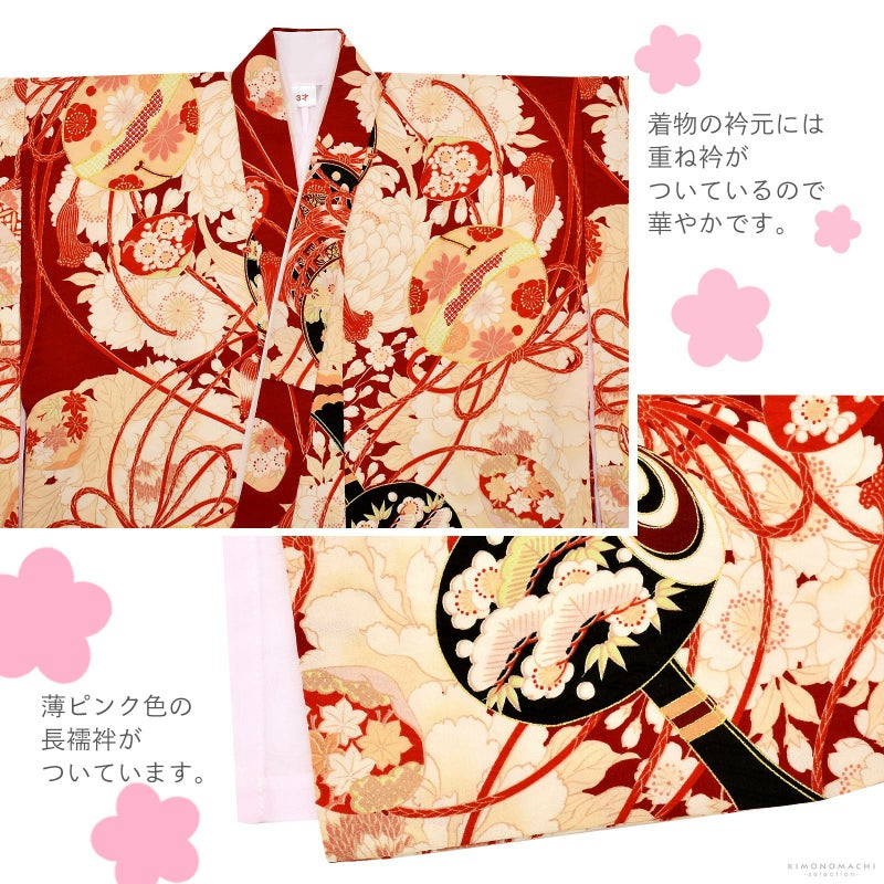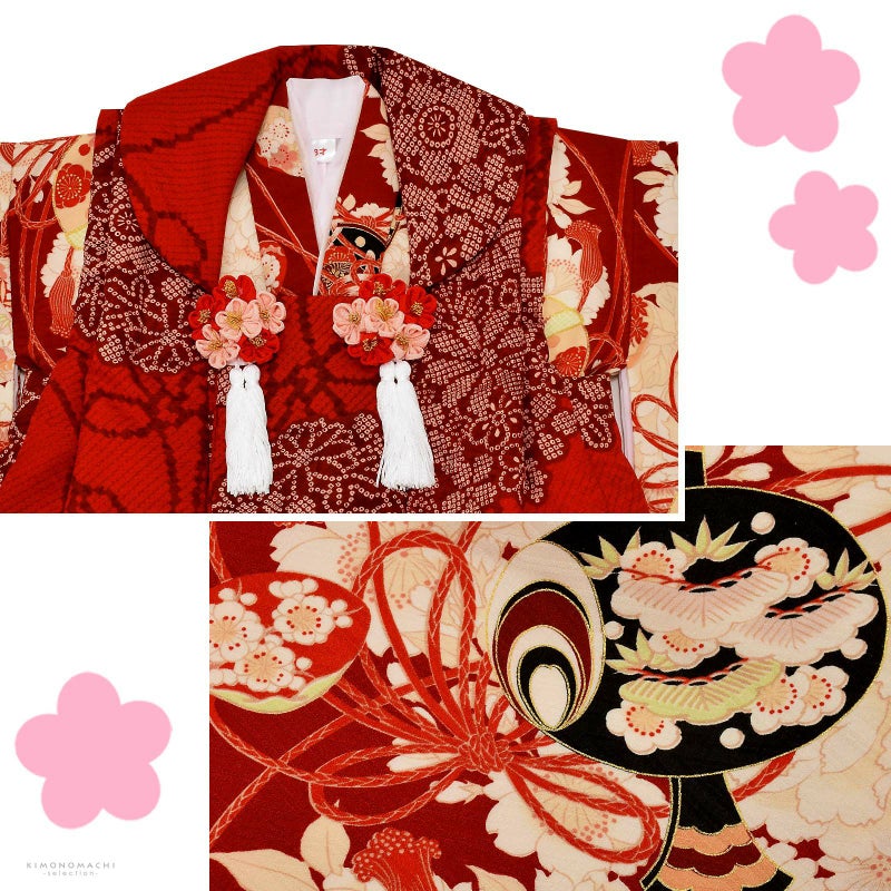被布コートは赤の疋田に深い錆赤の花文様。赤ピンクのつまみのお花に白い房の被布飾り。着物は深い赤地に淡いベージュで表現された牡丹や菊、桜の花々。その上に、黒や赤、ベージュの小槌や鈴、貝合わせ文や長い組紐文様。重ね衿は淡いピンクベージュ。草履は被布と共布の台に鼻緒。巾着は被布と共布、赤の紐。赤、ピンクのつまみのお花のクリップ。