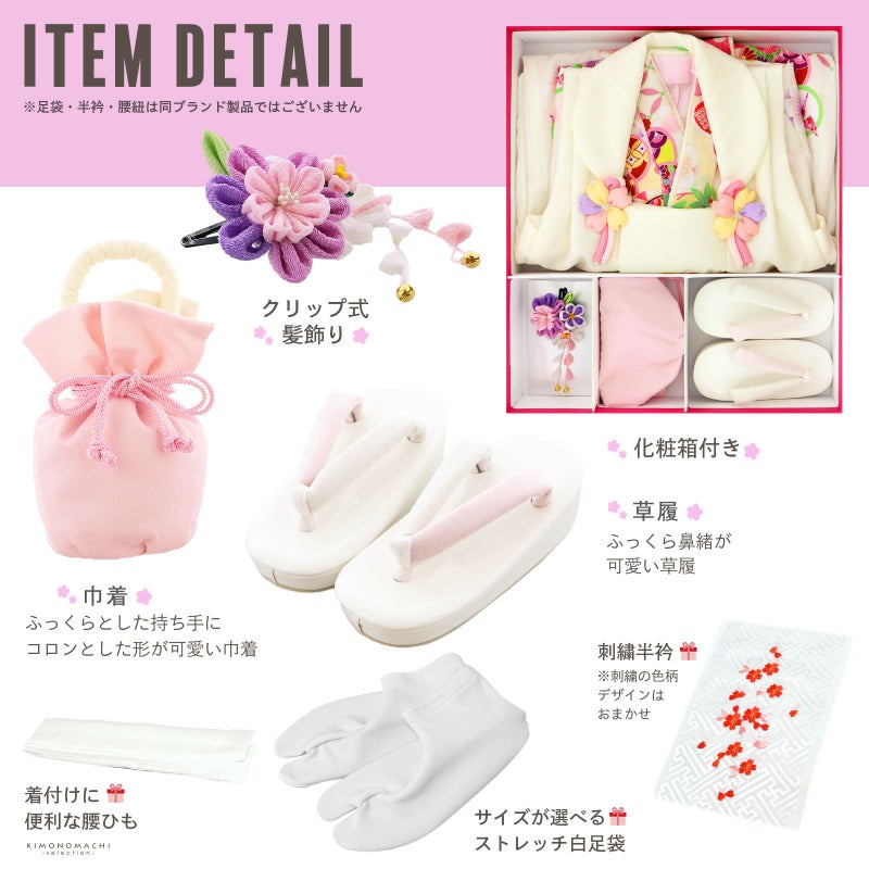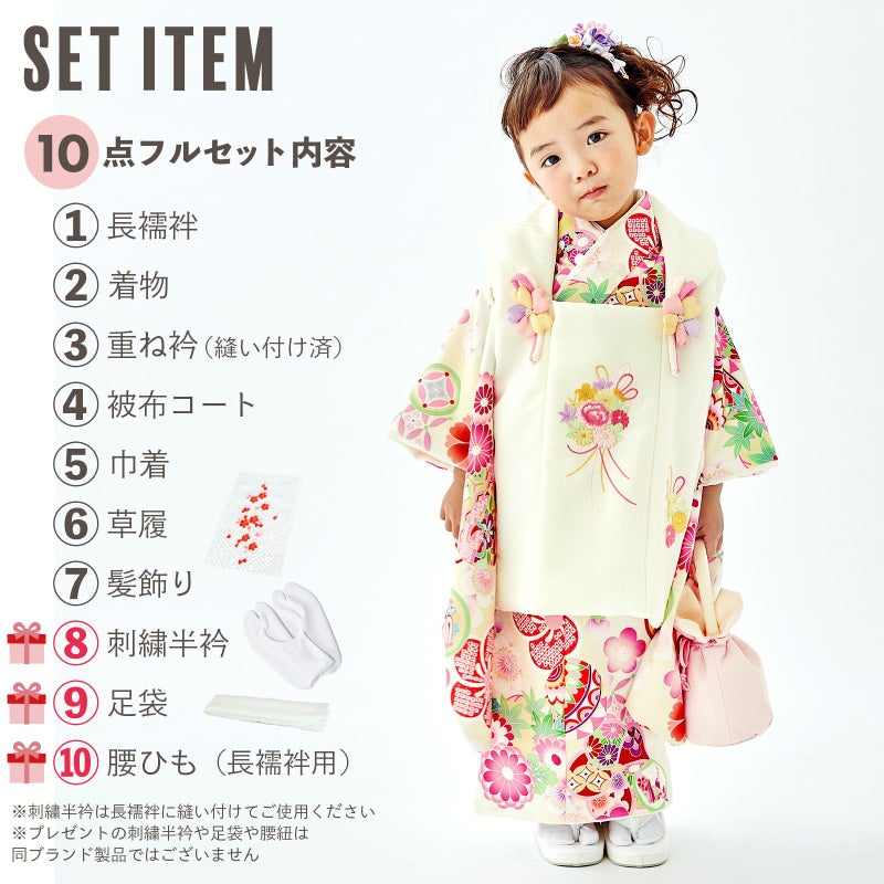 【商品内容】長襦袢・着物・重ね衿(縫い付け済)・被布コート・巾着・草履・髪飾り・刺繍半襟(プレゼント)・足袋(プレゼント)・腰ひも1本(プレゼント)の計10点