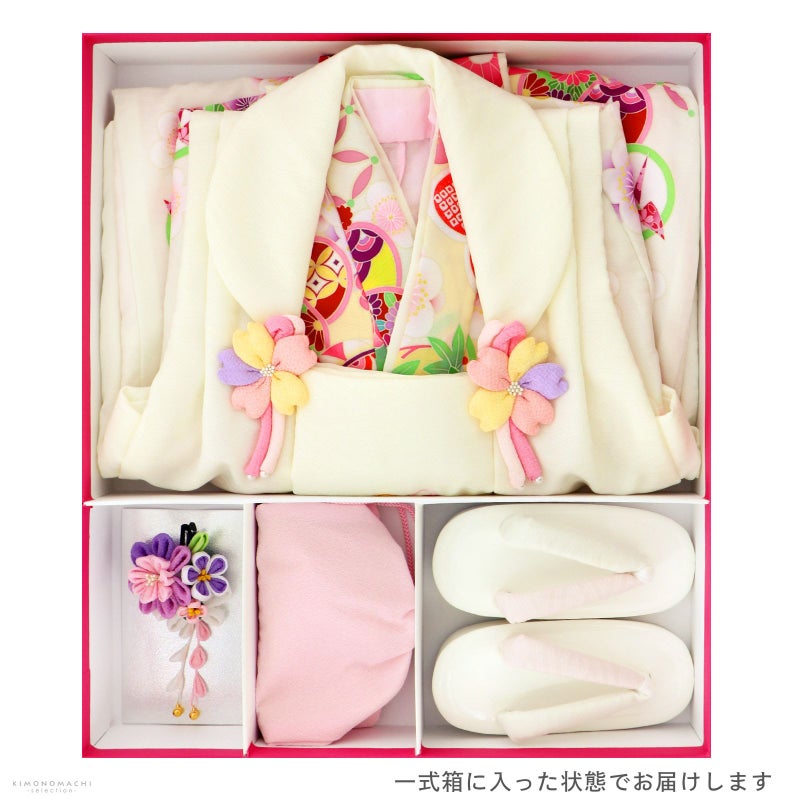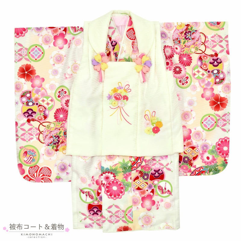 【色柄】被布コートはオフホワイトの地にピンクや黄色、薄緑色の花くす玉の刺繍。薄ピンクや黄色のつまみの桜の被布飾り。着物は地模様のあるオフホワイトに淡いクリーム色の縦ぼかし。ピンクや濃い赤、紫、緑などの配色の鈴や手鞠、花紋。朱色の七宝や小さな白ウサギなど。重ね衿はオフホワイト。薄ピンクの長襦袢。草履は白の台に薄ピンクと白の片ぼかしの鼻緒。巾着は淡いピンクの袋にアイボリーの見返しと持ち手。ピンクやパープル、白のつまみのお花の髪飾り。