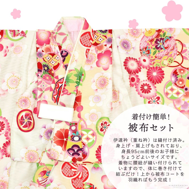 女の子の七五三に!3歳から着られる被布セットです。お着物には重ね衿が縫い付けられています。オシャレで女の子らしく華やかなデザイン。七五三だけでなく、お正月やひな祭りの節句にも。